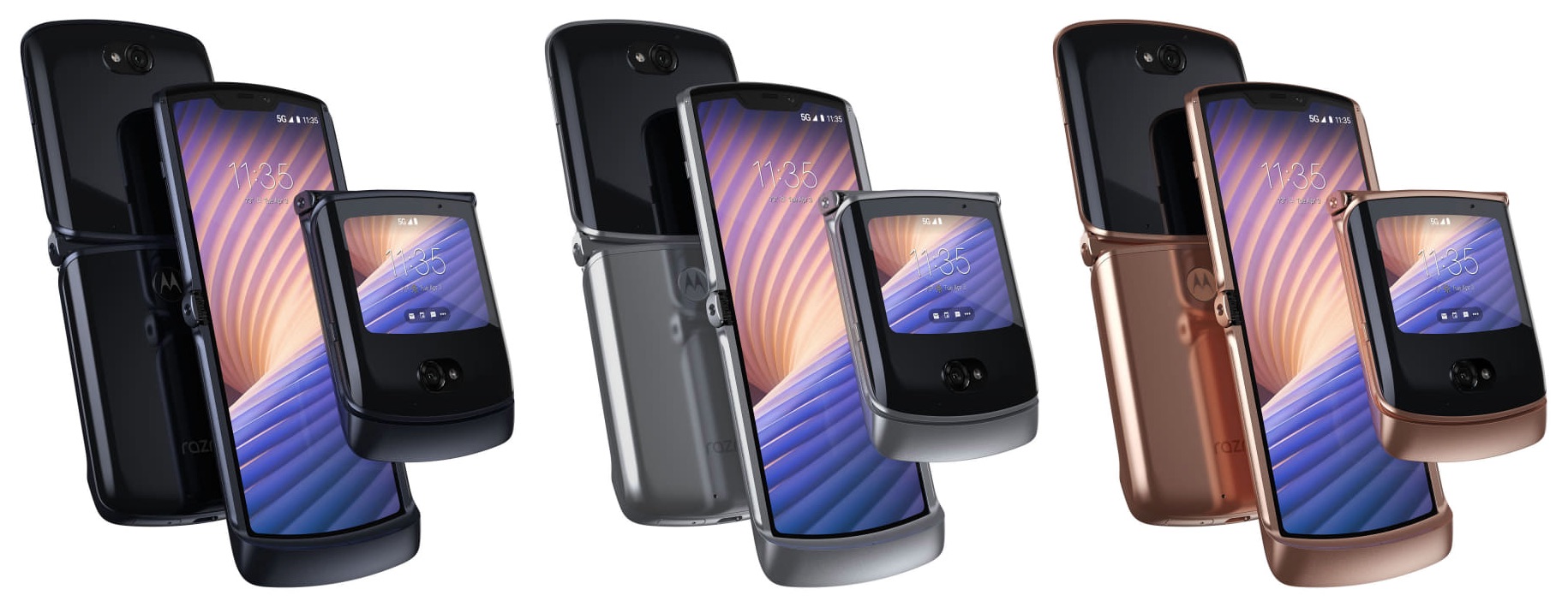 motorola razr 5Gはmotorola razrと同様に折りたたみ型ケータイ(フィーチャーフォン、いわゆる「ガラケー」)のように縦に折りたたむ形状で、内側にアスペクト比9:21の2つに折り畳めるメインディスプレイ、外側にサブディスプレイを搭載したミッドハイレンジクラスのAndroidスマホで、他社ではサムスン電子製「Galaxy Z Flip」と同じタイプとなります。