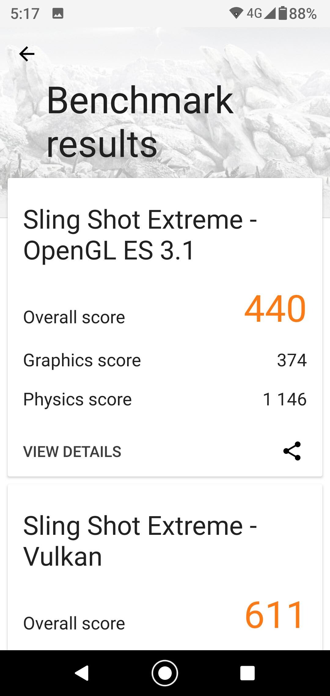 ベンチマークアプリ「Geekbench 5」と「3DMark」のSling Shot Extremeの結果。Singleで165、Multiで1005、OpenGL ES 3.1で440、Vulkanで611。同じHelio P35を搭載する「moto g8 power lite」と同程度。操作によっては若干ワンテンポ待たされるような操作感