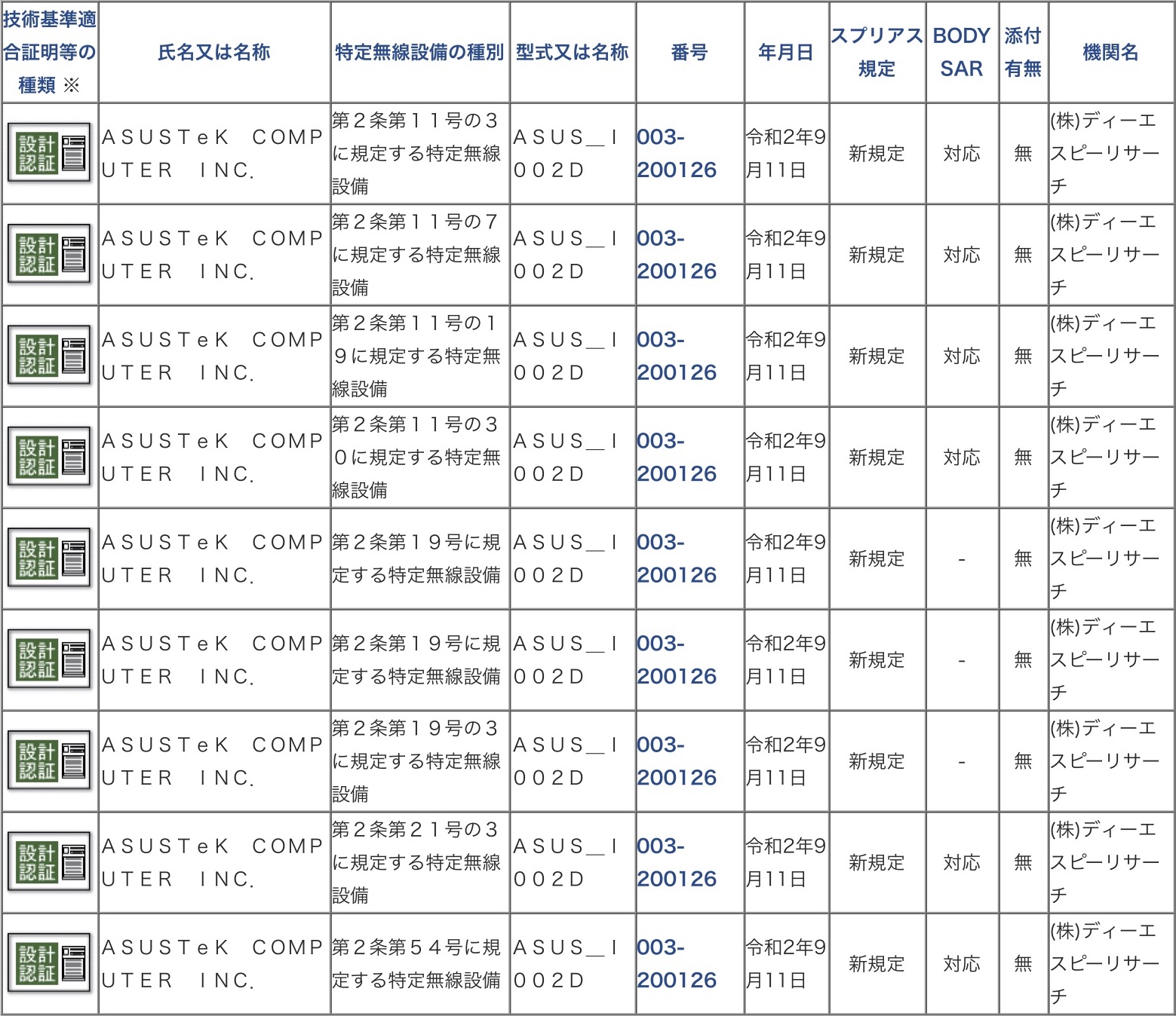 総務省が「技術基準適合証明等を受けた機器の検索」のデータベースを更新し、新たにASUSTeK Computer(以下、ASUS)が「ASUS_I002D」(認証番号:003-200126)の工事設計認証(いわゆる「技適」)を2020年9月11日付けでディーエスピーリサーチによって取得しています。