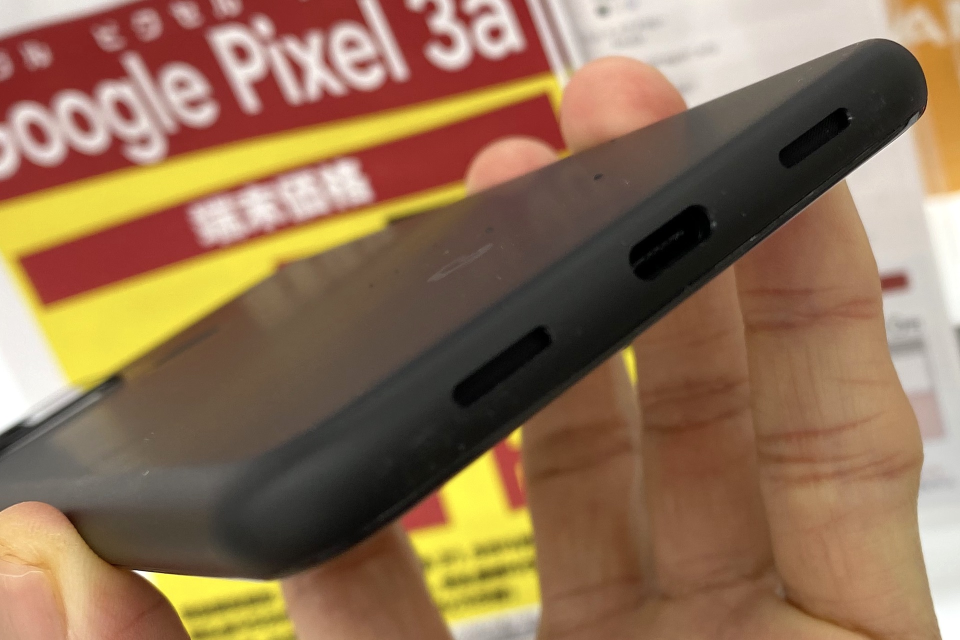 こちらはPixel 5のもう1色であるJust Black(ジャスト ブラック)。同様にマットかつザラザラした質感で、よく見ると何かが混じっているような見た目となっている。背面には指紋センサー「Pixel Imprint」を搭載