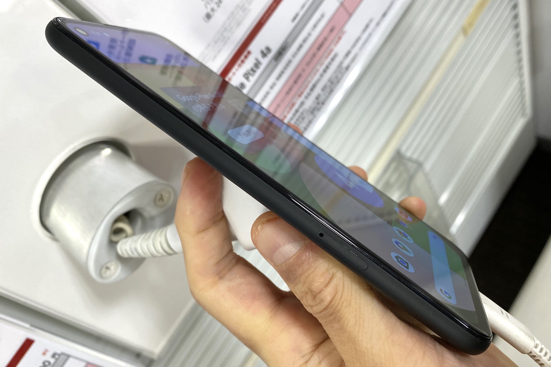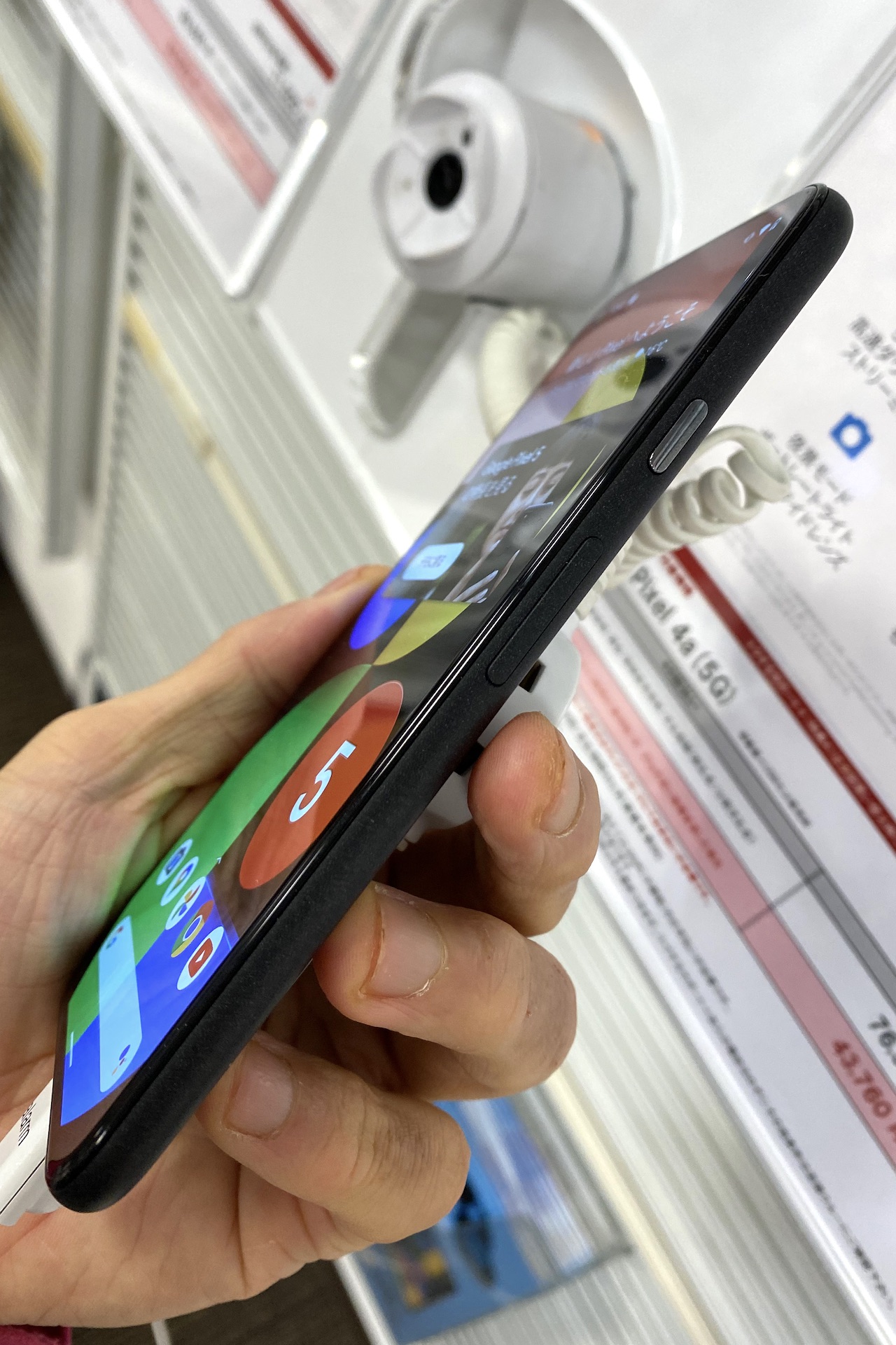 続いてPixel 4a (5G)をチェックしてみます。Pixel 4a (5G)はPixel 4aとPixel 5を足して2で割って大画面にした感じ。画面サイズは上述通りに6.2インチサイズとなっており、持った感じはPixel 5やPixel 4aよりもひと回り大きい印象で、手の小さい人などはちょっと手に余るのではないでしょうか。