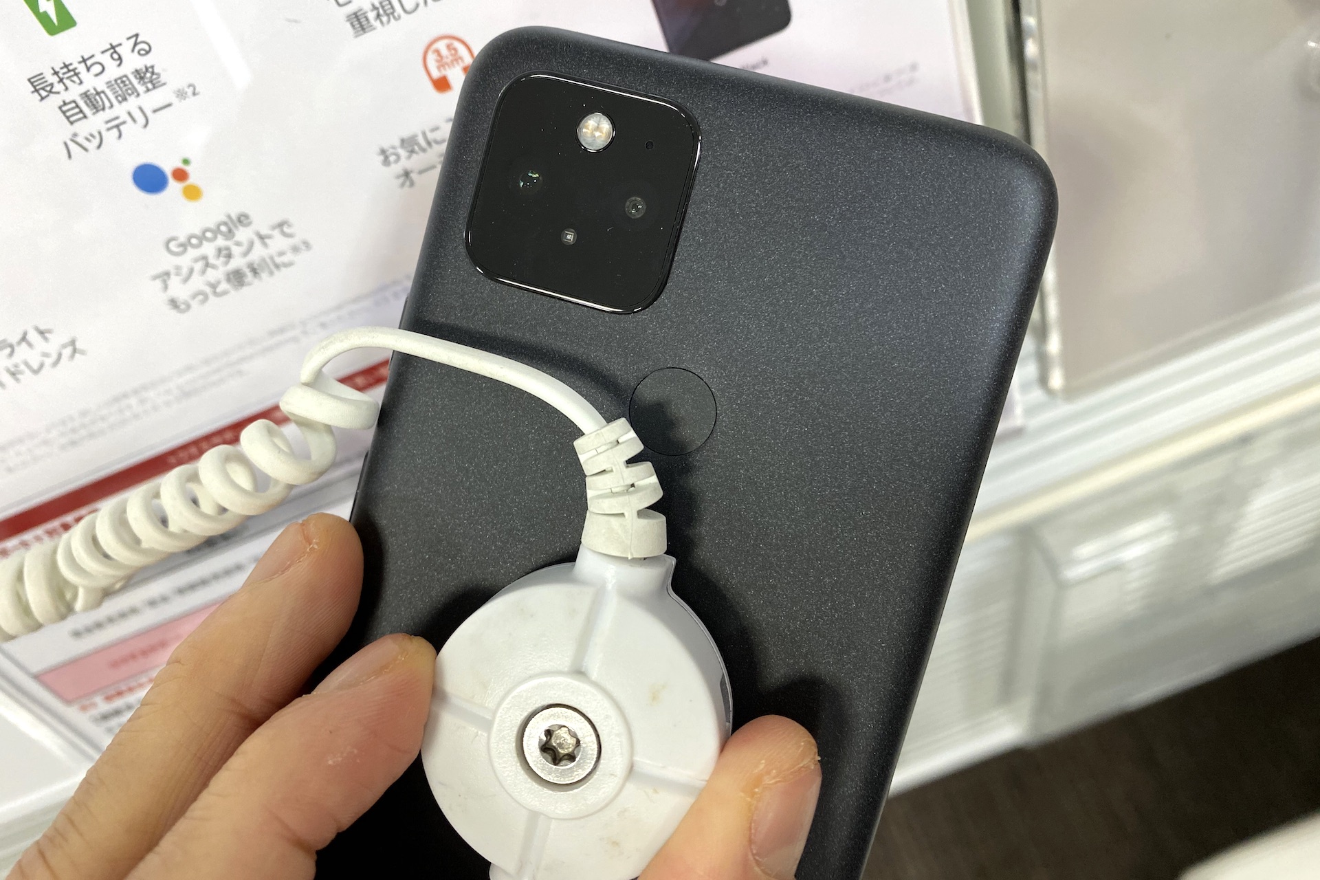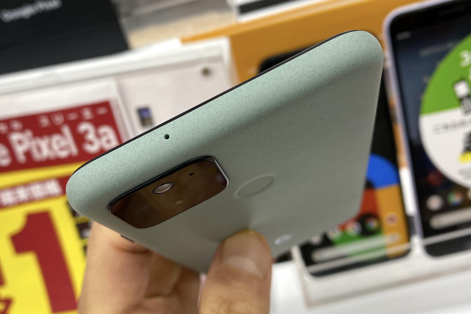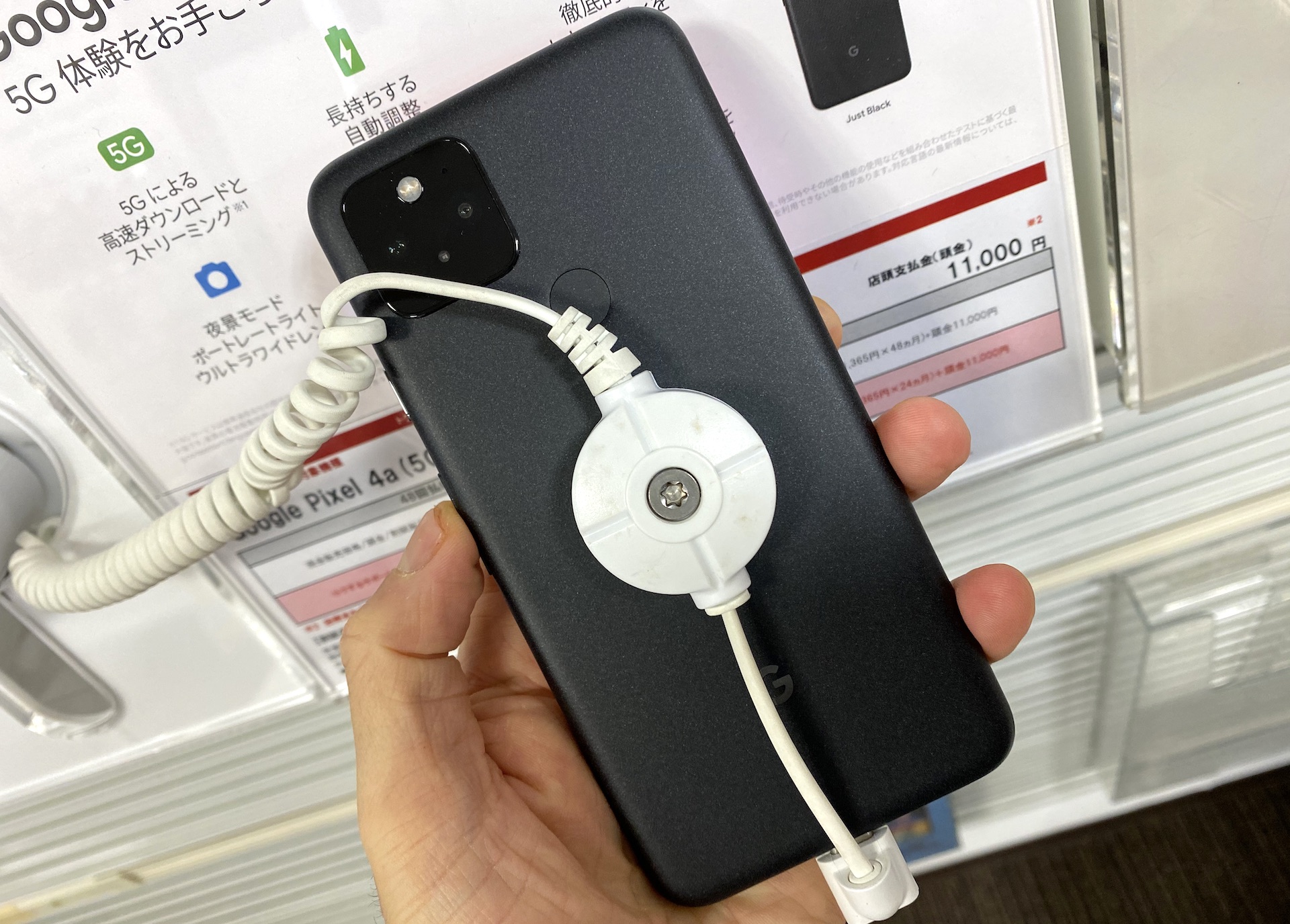 Pixel 4a (5G)の背面。同じジャスト ブラックでもPixel 5とは質感や見た目も異なる。なお、海外ではPixel 4a (5G)はCleary Whiteもラインナップされているものの、日本では現時点では販売されない模様