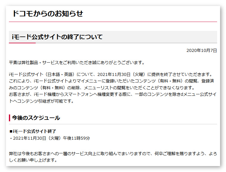 NTTドコモは7日、ひっそりと1つのプレスリリースを公開しました。既報通り、2021年11月30日をもって「iモード公式サイト」の提供を終了するという内容です。「iモード」自体は2026年3月31日に終了となりますが、それに先立ち「店じまい」の支度としての公式サイト終了ということになります(2026年3月31日までは各企業のiモードサイトなどは利用可能)。