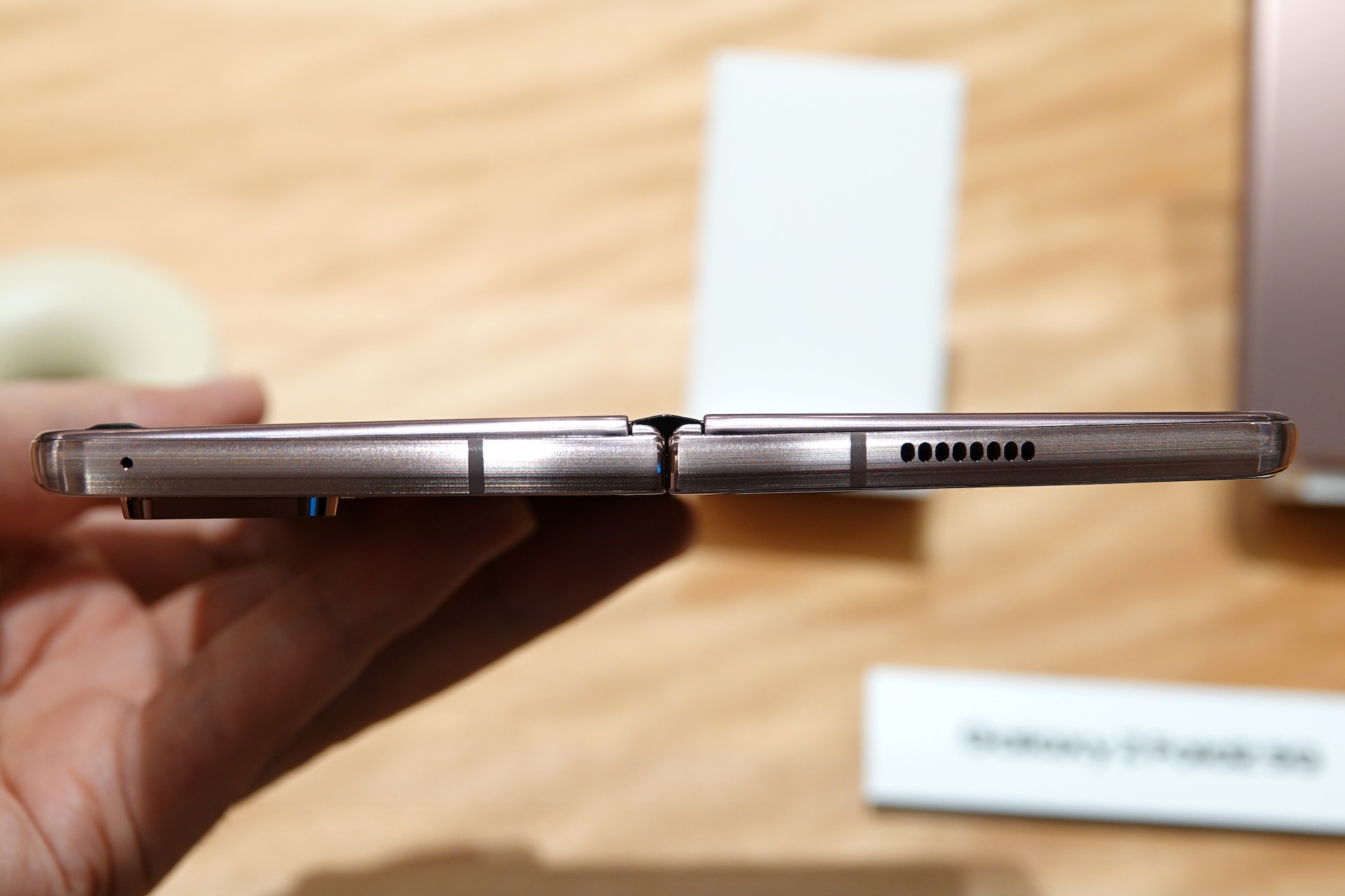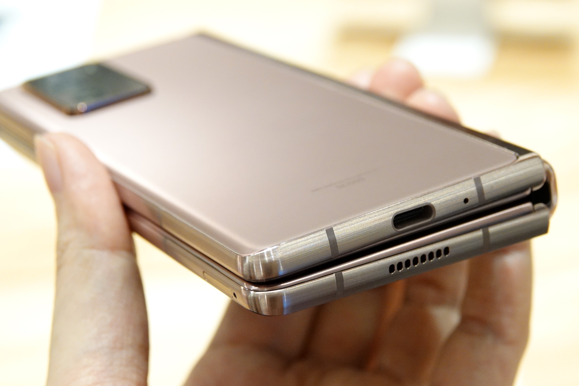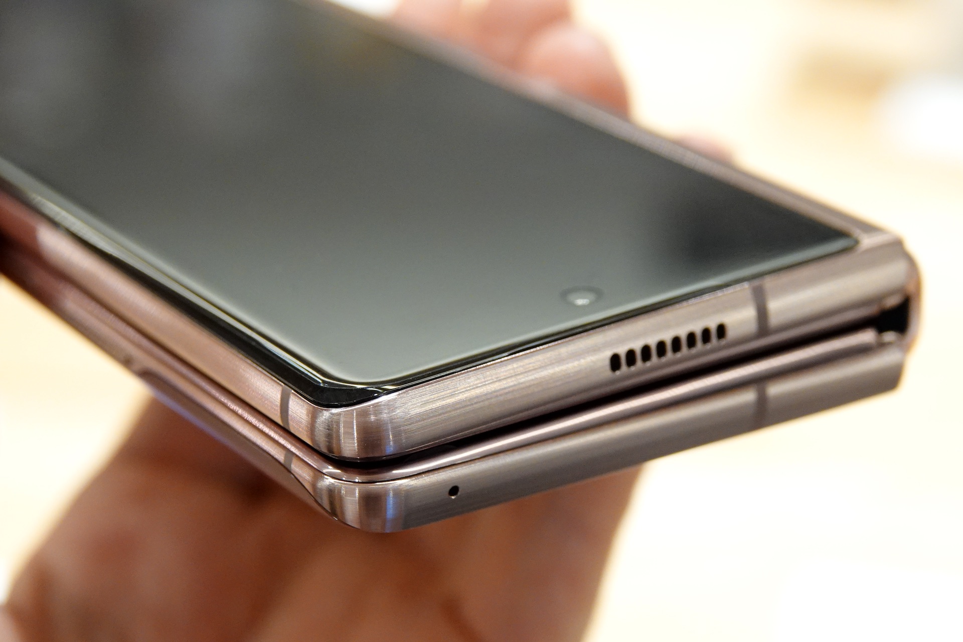 開いた状態の本体上部側面。Galaxy Z Fold2ではよりエッジの角が強調され、シャープな印象となったほか、ヒンジから反対方向に先細りで厚みの幅が大きくなったことで、折りたたんだ隙間も目立たなくなっている