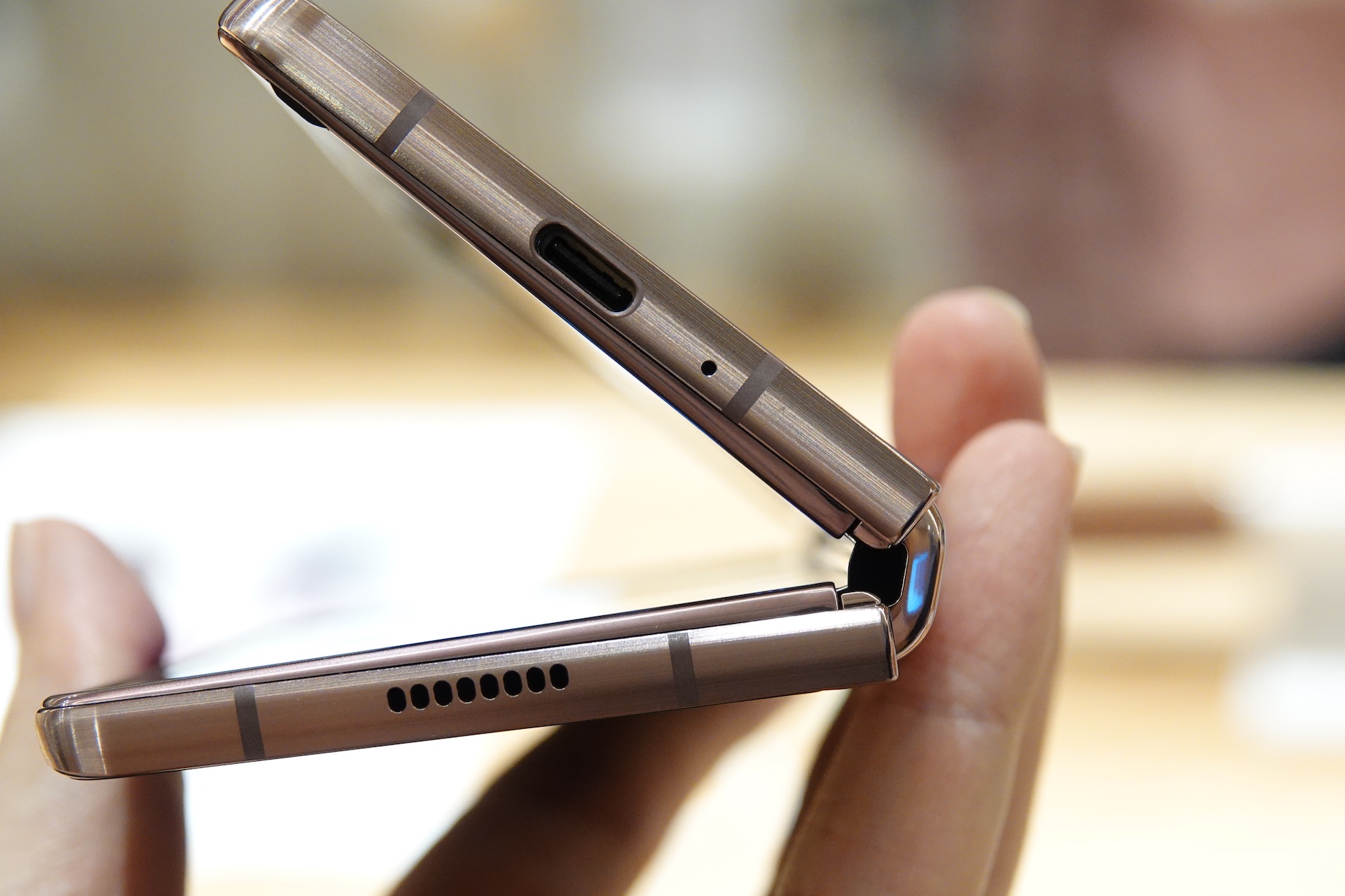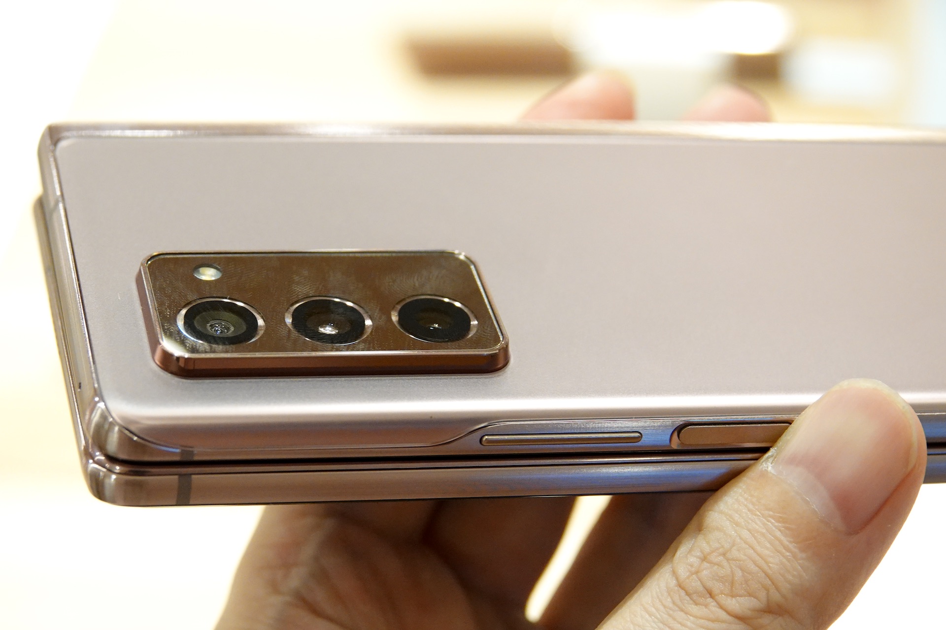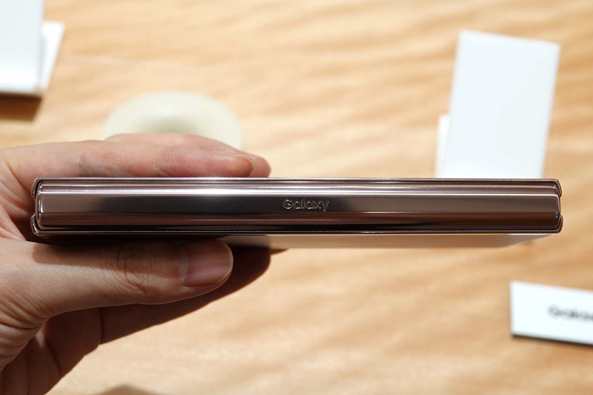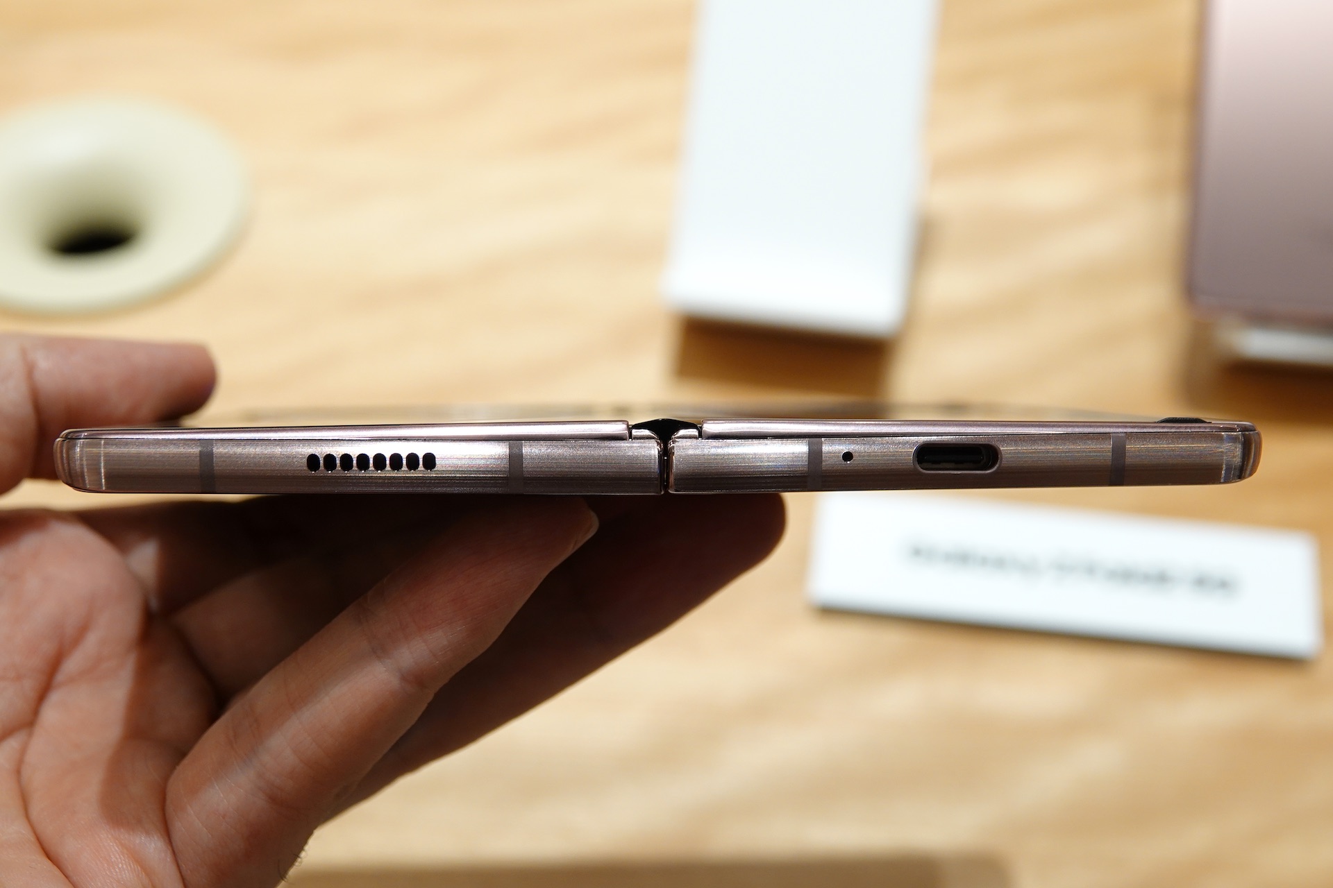 開いた状態の本体上部側面。Galaxy Z Fold2ではよりエッジの角が強調され、シャープな印象となったほか、ヒンジから反対方向に先細りで厚みの幅が大きくなったことで、折りたたんだ隙間も目立たなくなっている