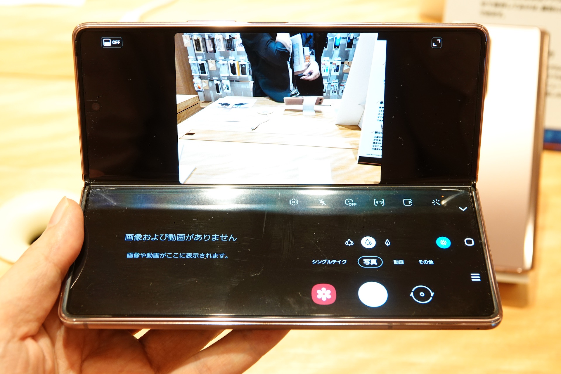 こちらはカバーディスプレイでの視聴に切り替えたところ。カバーディスプレイはアスペクト比25:9の約6.2インチHD+(2260x816ドット)有機EL「Super AMOLED Display」(約386ppi)