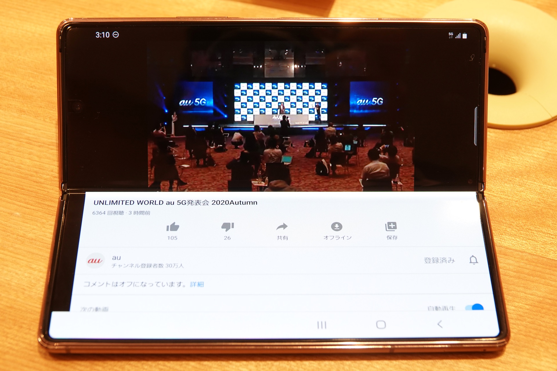 フレックスモードでYouTubeを視聴しているところ。Galaxy Foldでは開くか閉じるかでフレックスモードには対応していなかったが、Galaxy Z Fold2ではヒンジは角度を自由に調整できるようになった