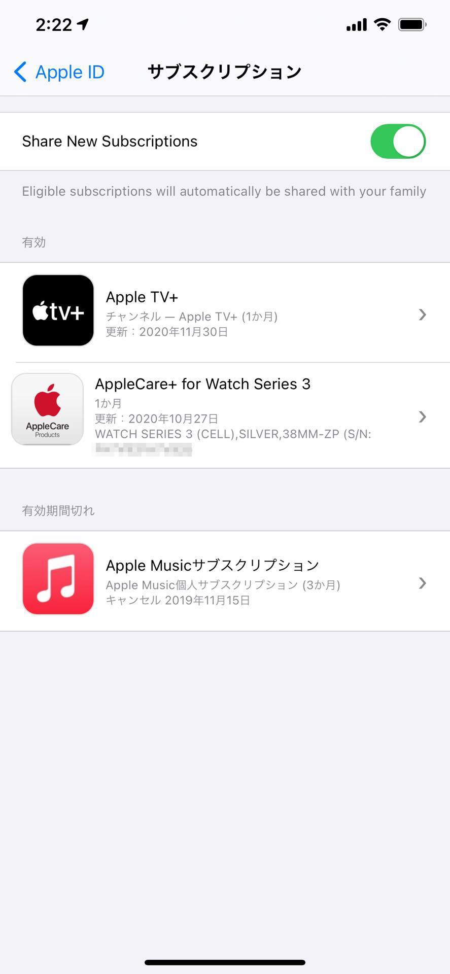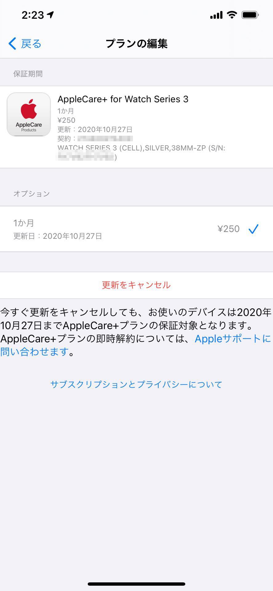 ここまで設定すれば、iPhoneやiPadなどで「設定」の上部にある自分の名前部分をタップしたところにある「サブスクリプション」にAppleCare+の月額払いが表示されるようになり、ここから「更新をキャンセル」して手軽にAppleCare+の月額払いを終了することも可能となっていました