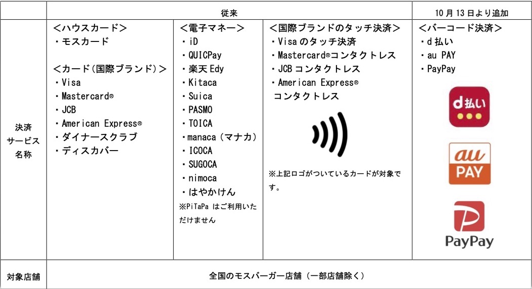 モスフードサービスは12日、同社が展開する全国のハンバーガーチェーン「モスバーガー」(一部除く)においてスマートフォン(スマホ)など向けコード決済サービス「d払い」および「au PAY」、「PayPay」の導入を2020年10月13日(火)に開始すると発表しています。