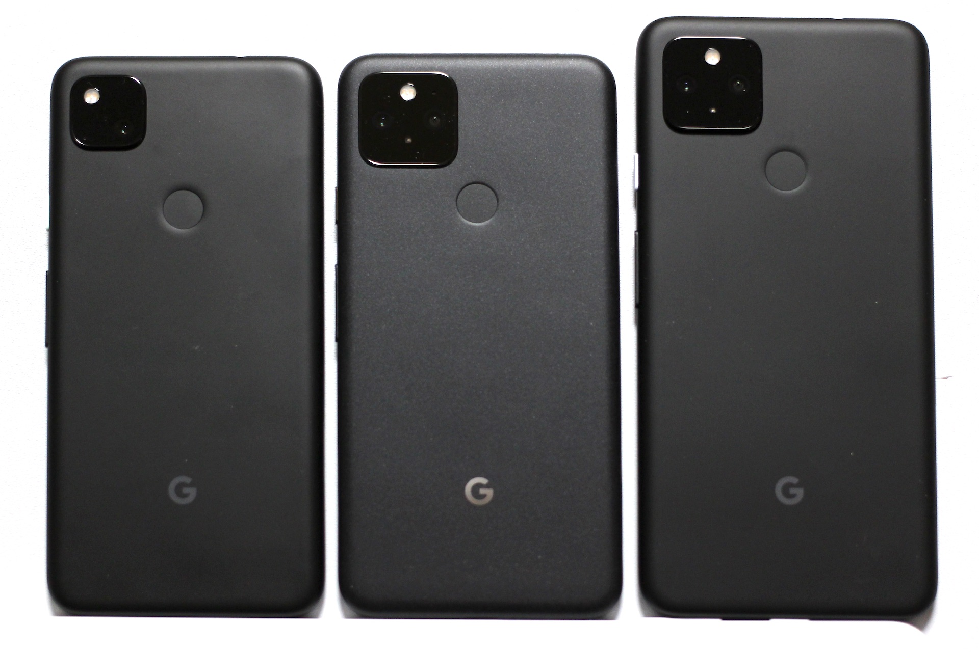 左からPixel 4a、Pixel 5、Pixel 4a (5G)。リアカメラはPixel 4aのみシングルカメラで、Pixel 5とPixel 4a (5G)は広角+超広角のデュアルカメラとなっている