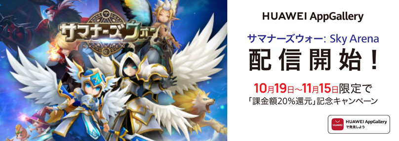 その他、同社ではHUAWEI AppGalleryにてスマートフォン(スマホ)など向けゲーム「サマナーズウォー: Sky Arena」( https://appgallery.huawei.com/#/app/C102298415 )の配信が10月15日(木)から開始し、配信を記念して「課金額20%還元」キャンペーンを10月19日(月)から11月15日(日)まで実施しています。