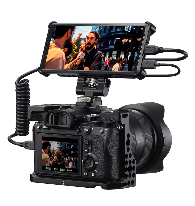 しかも、登録したアプリをすぐに起動できるショートカットキーを搭載しており、この機能も素早く利用可能。さらにmicroHDMI端子(Type D)を搭載しているため、レンズ交換式デジタル一眼カメラやプロフェッショナル向けカムコーダーをHDMI接続してXperia PROをモニターとして利用しながら撮影中の映像データを伝送することもできるようになっています。