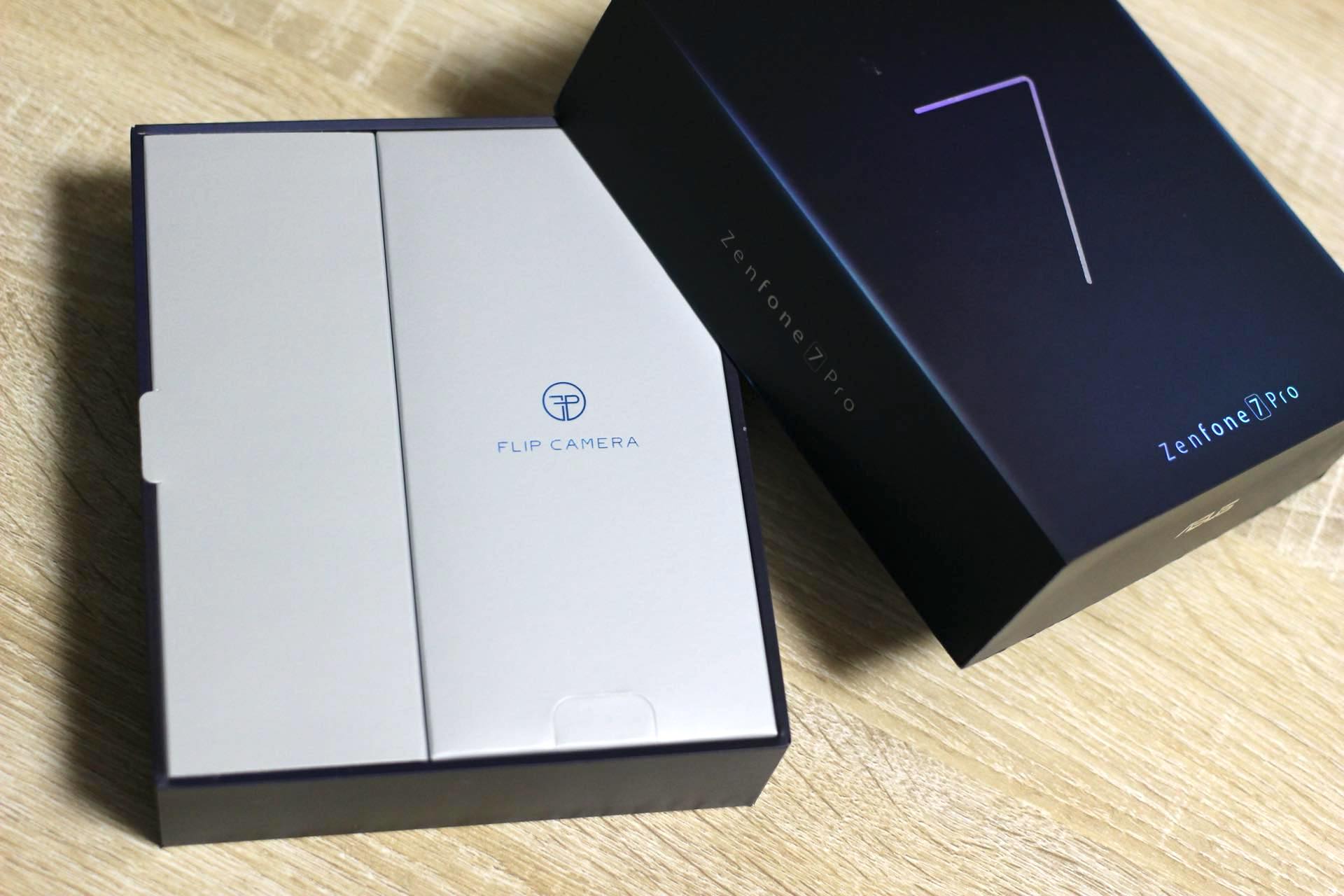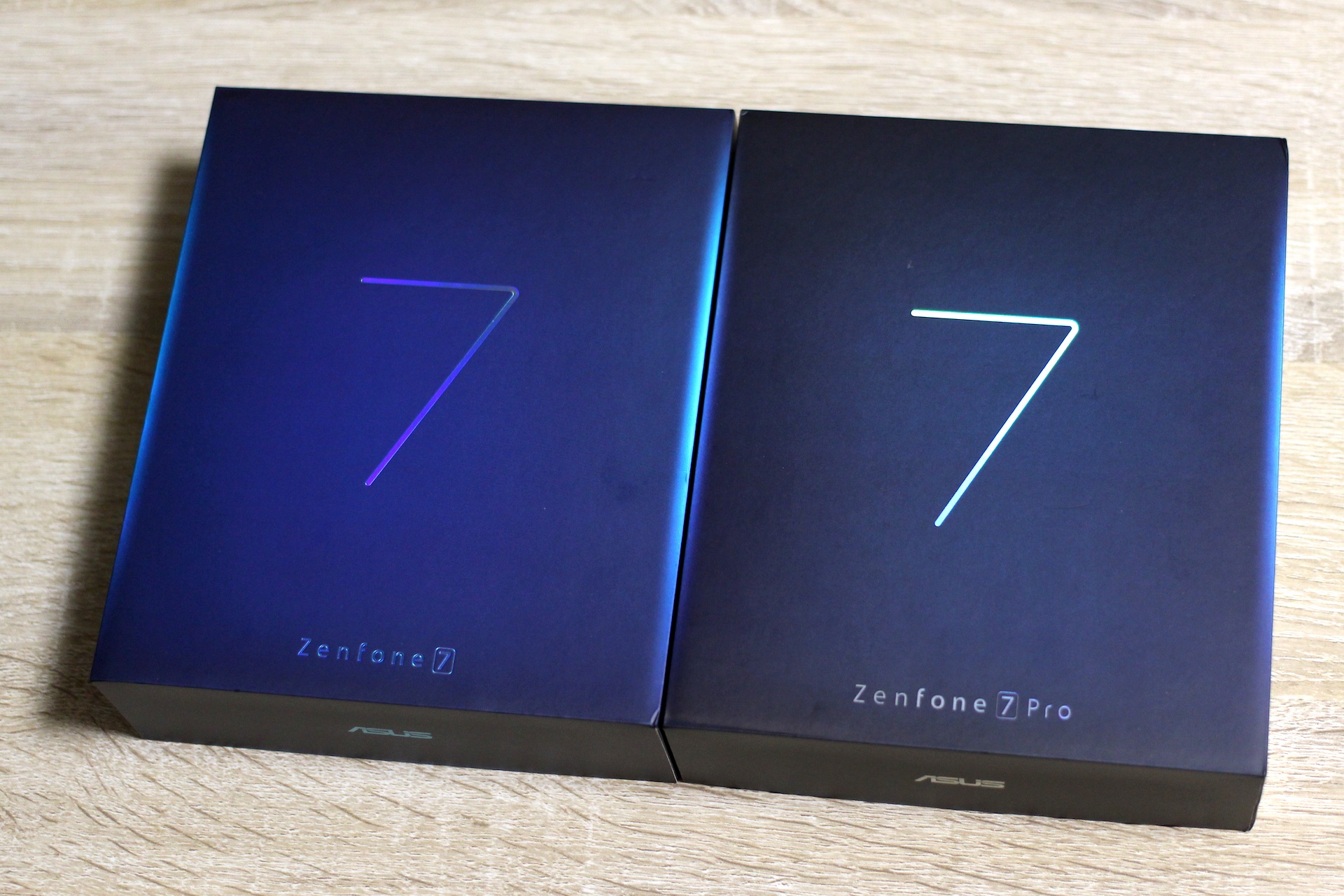 本体色の違いなのかとも思いましたが、他のレビューなどを見る限りでは機種の違いのようで、ZenFone 7のパッケージの方がより青の入り方が強く、「7」の文字も青っぽくなっており、逆にZenFone 7 Proの方の「7」は白抜きで、パッケージの左右が少し青くなっています。