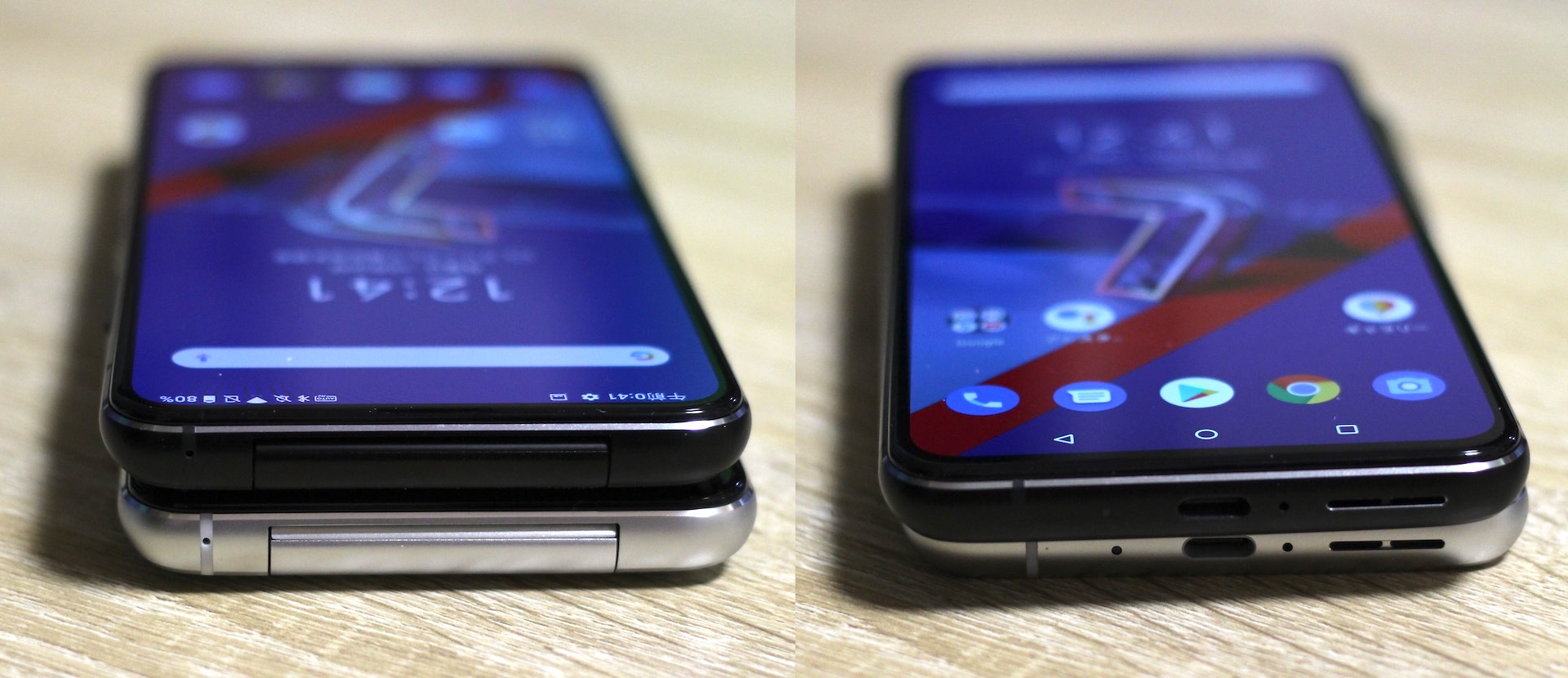 ZenFone 7とZenFone 7 Proの左右側面。右側には音量上下キーや指紋センサーを兼ねた電源/スリープキー、左側にはmicroSDXCカード・nanoSIMカードのスロットが配置。フリップカメラは収納されているときに背面側に出っ張っているため、背面を下にして置いたときに若干斜めになっています。ただし、幅も広く中央に配置されているため、カタカタしたりはしません