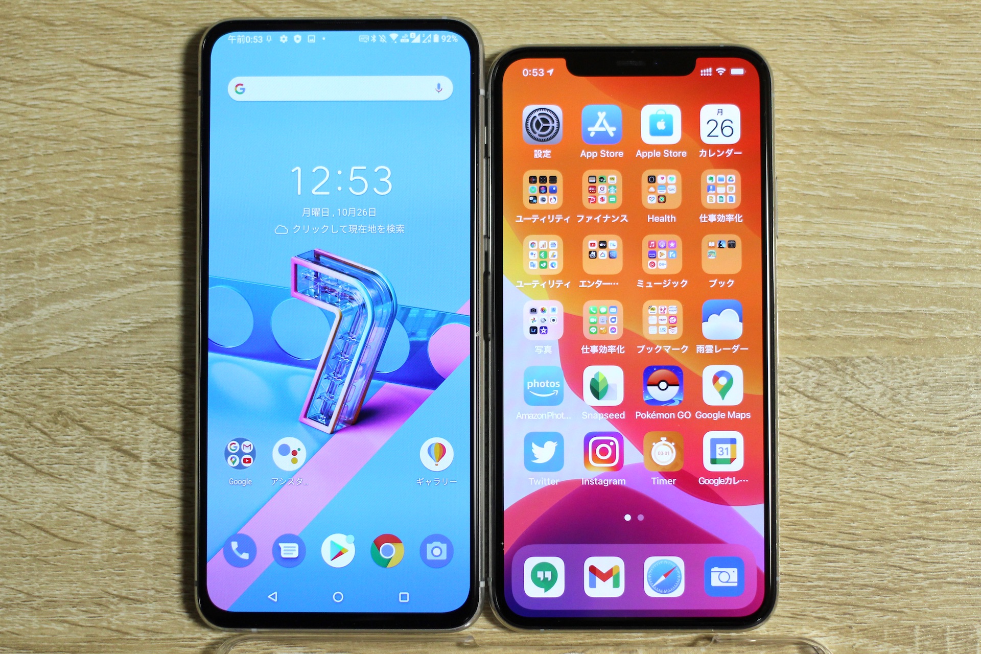 大きさ比較として6.5インチサイズのiPhone 11 Pro Max(大きさは約158.0×77.8×8.1mm)と並べてみたところ。画面のアスペクト比の違いで、縦はZenFone 7やZenFone 7 Proの方がかなり長いですが、幅はほとんど同じ。またZenFone 7およびZenFone 7 Proは約235gと、筆者が普段使っている約226gのiPhone 11 Pro Maxよりもさらに重い