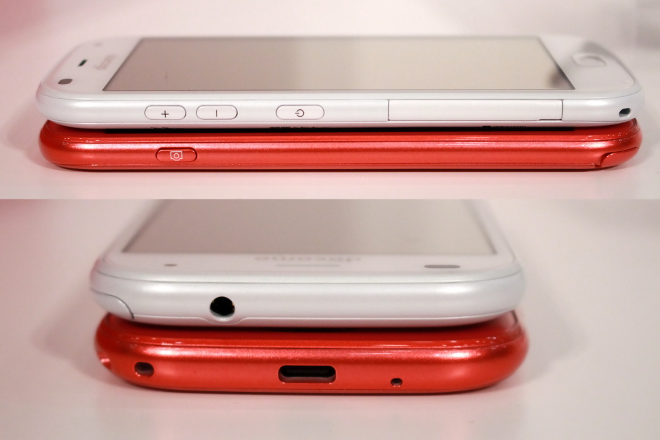 本体の左側面には「+-ボタン(音量上下キー)」と「電源ボタン」とカードスロットを搭載。本体右側面にはカメラボタンを、上部側面には3.5mmイヤホンジャック、下部側面にはUSB Type-Cの端子を備える。