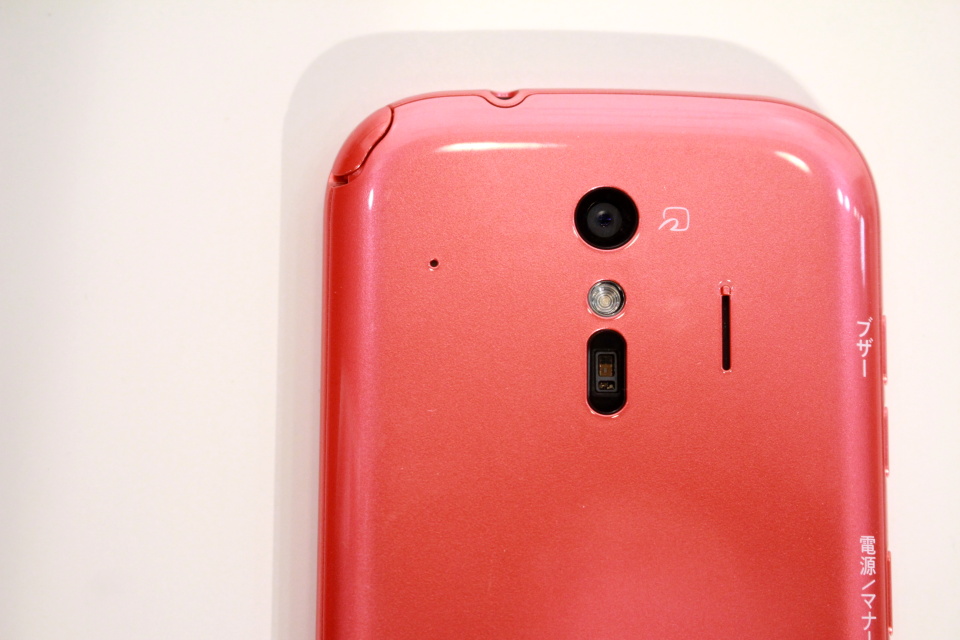 また丸みを帯びた本体の背面の角部分には「ブザー」や「電源/マナー」、「microSD」と、左側面に搭載されているボタンやカードスロットの説明が日本語で記載されている。