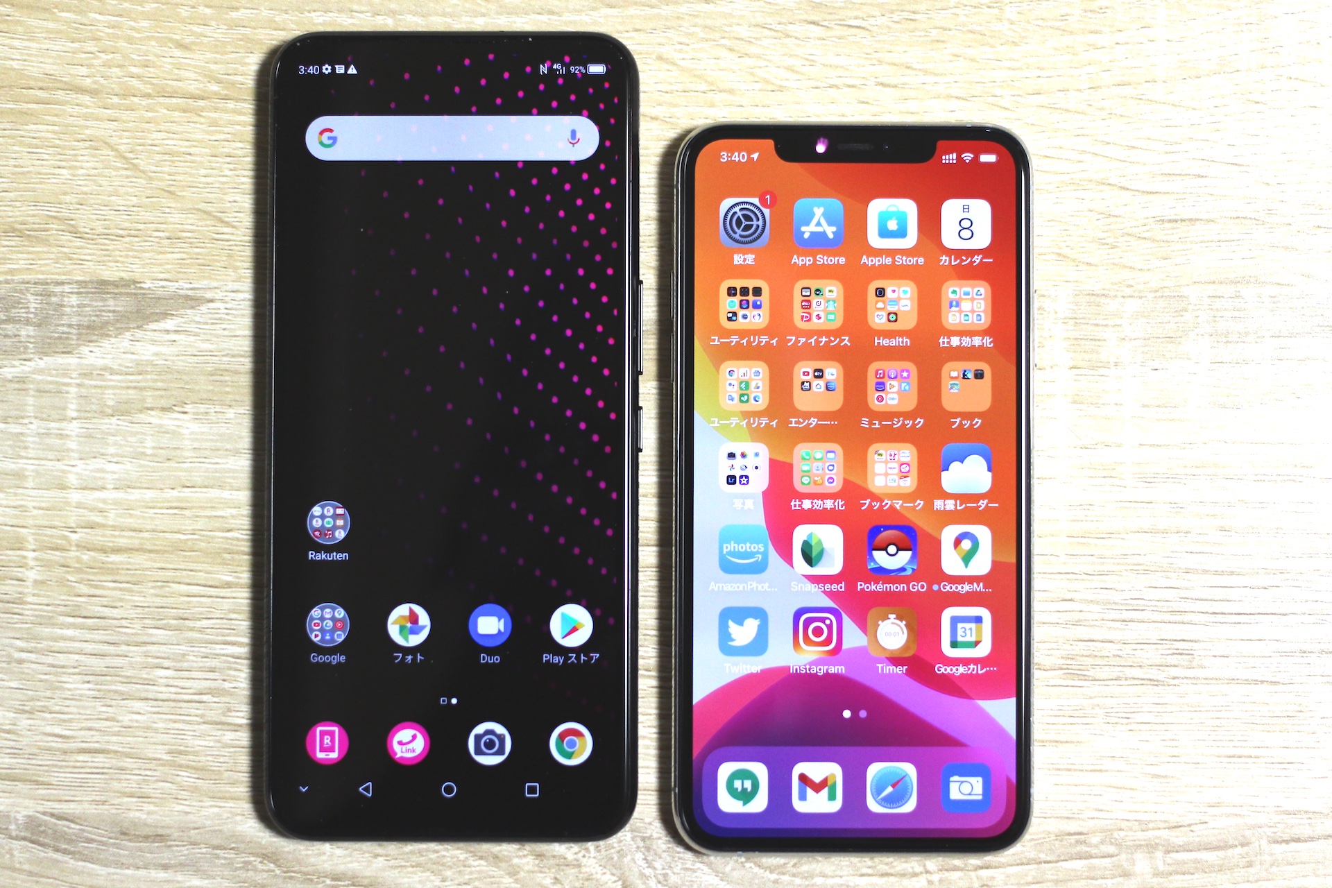 6.9インチサイズのRakuten BIG(左)と6.5インチサイズのiPhone 11 Pro Max(右)を横にして並べてみたところ。幅の違いはわずかにiPhone 11 Pro Maxのほうが狭い程度