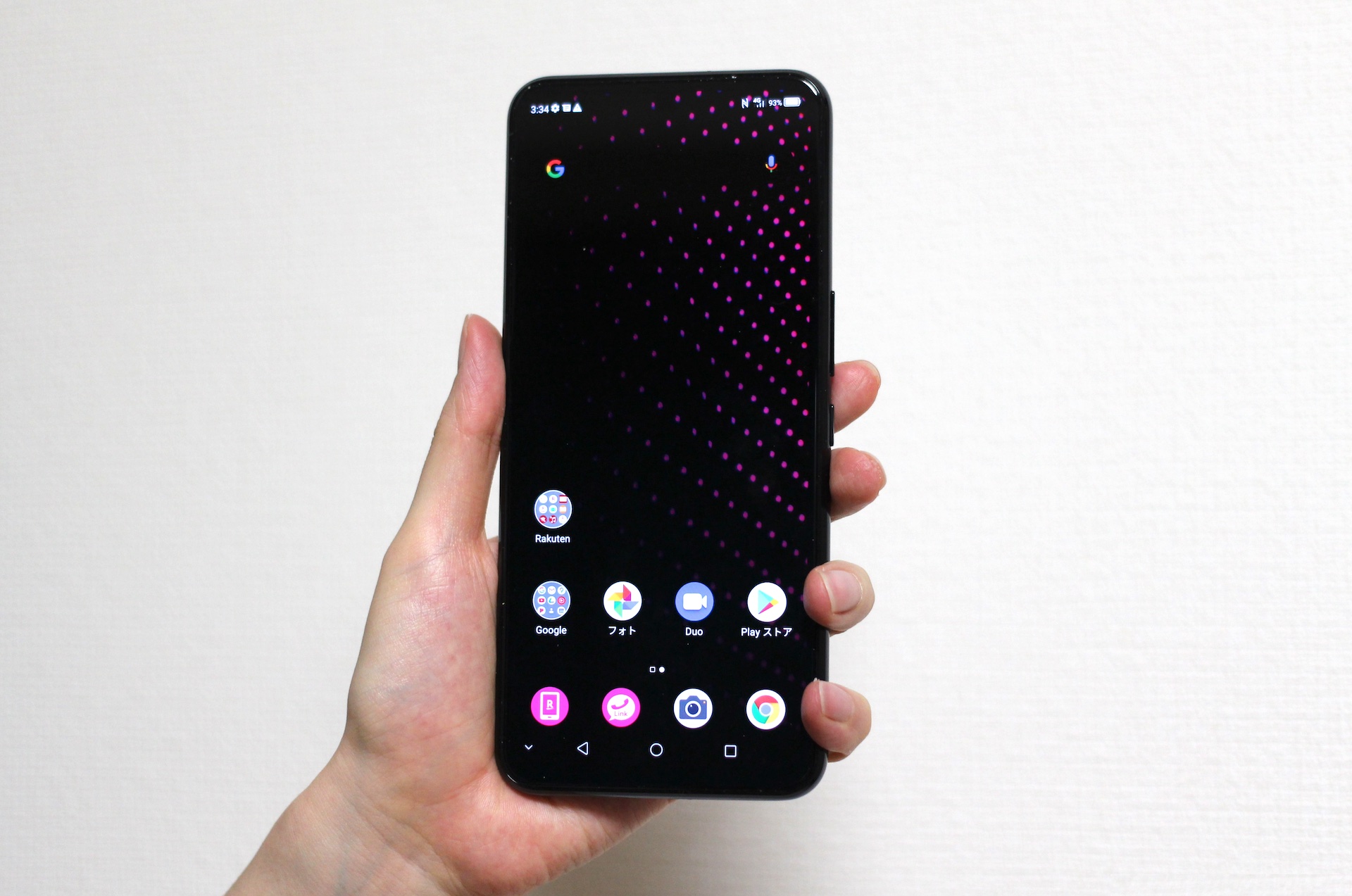 ディスプレイは切り欠きのないアスペクト比9:20.5の縦長な約6.92インチFHD+(1080×2460ドット)有機EL(OLED)を搭載し、10bit色表示やDCI-P3色域100%、HDR 10+、リフレッシュレート90Hz、タッチサンプリングレート240Hzをサポートしています。またパッと見ではわかりませんが、よく見ると真ん中付近にフロントカメラと思われるものが見えます。