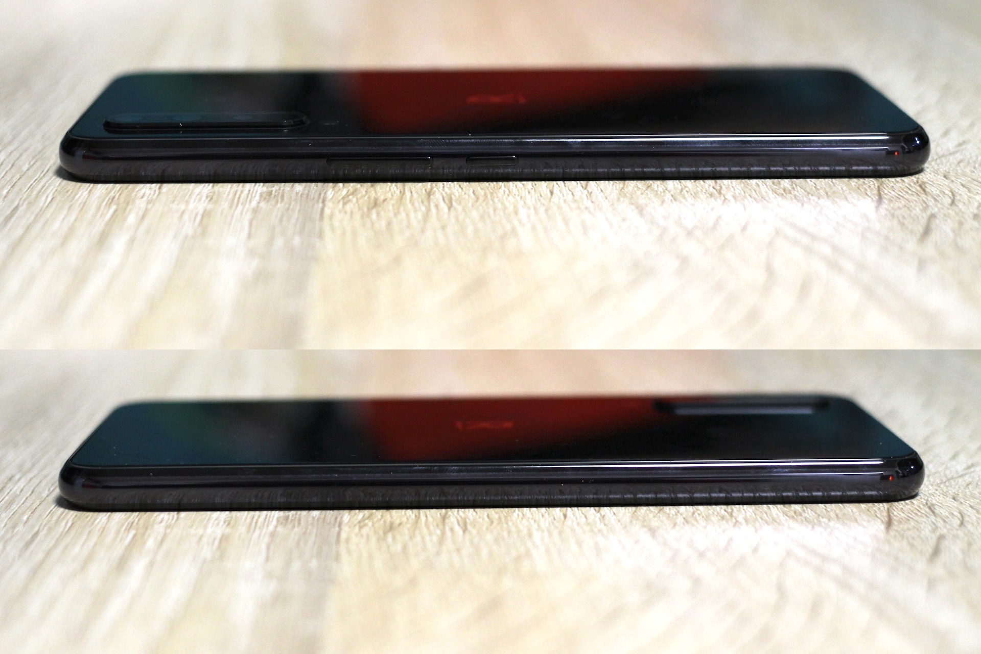 サイズ比較として6.9インチサイズのRakuten BIG(左)と6.5インチサイズのiPhone 11 Pro Max(右)を並べてみたところ。縦はやはりRakuten BIGがだいぶ長い(iPhone 11 Pro Maxのサイズは約158.0×77.8×8.1mm)