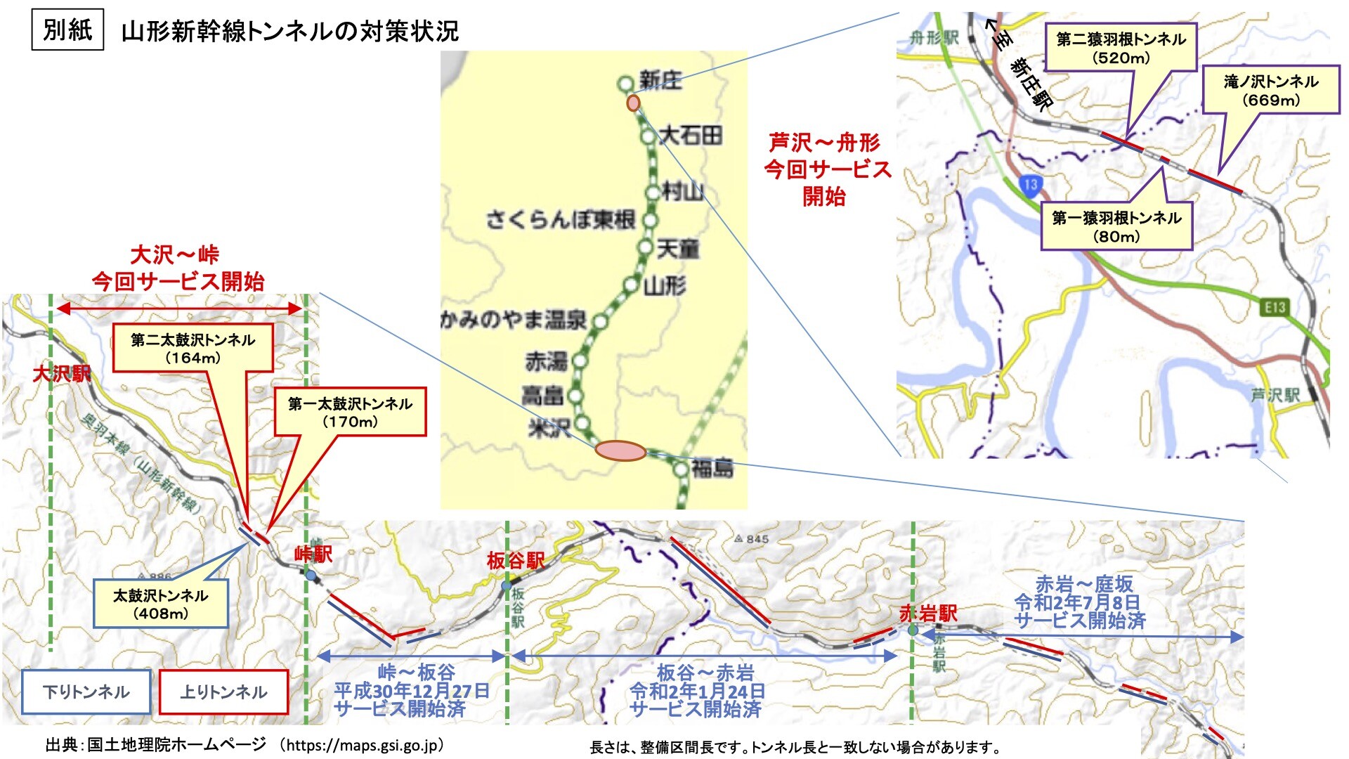 今回、山形新幹線の最後の工事区間である峠駅~大沢駅及び芦沢駅~舟形駅間の計6トンネル(約2.0Km)における携帯電話用基地局の設置工事が完了し、新たに携帯電話サービスが利用可能となります。なお、これらの区間は以下の総務省 東北総合通信局より2019年8月21日に補助金が交付決定となった電波遮へい対策事業です。