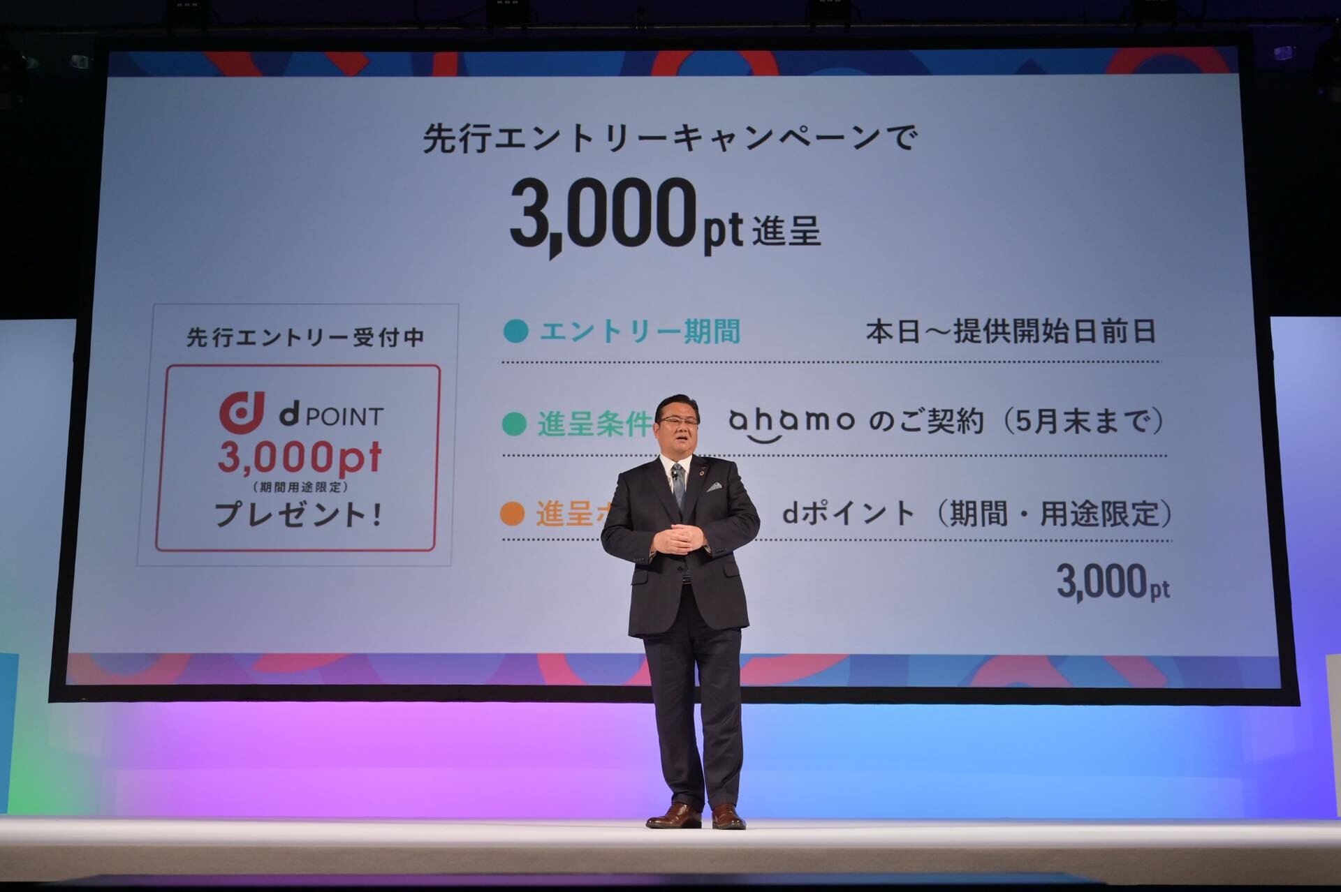 またahamoの提供開始に先立って12月3日より提供開始日の前日まで先行エントリーを受け付けし、ahamoの専用Webサイトから電話番号とメールアドレスを登録して提供開始後にahamoを契約することでdポイント(期間・用途限定)が3,000ポイントプレゼントされます。