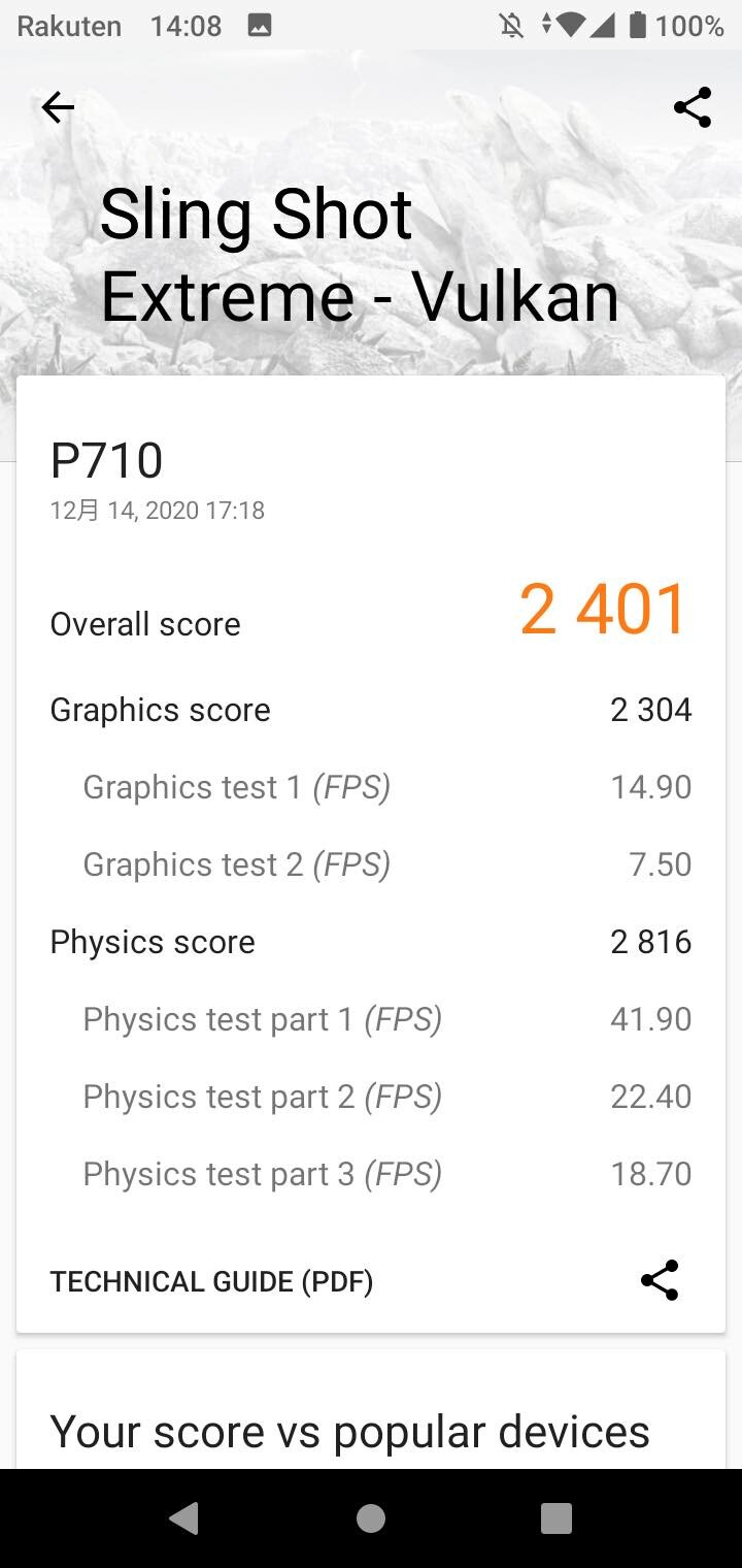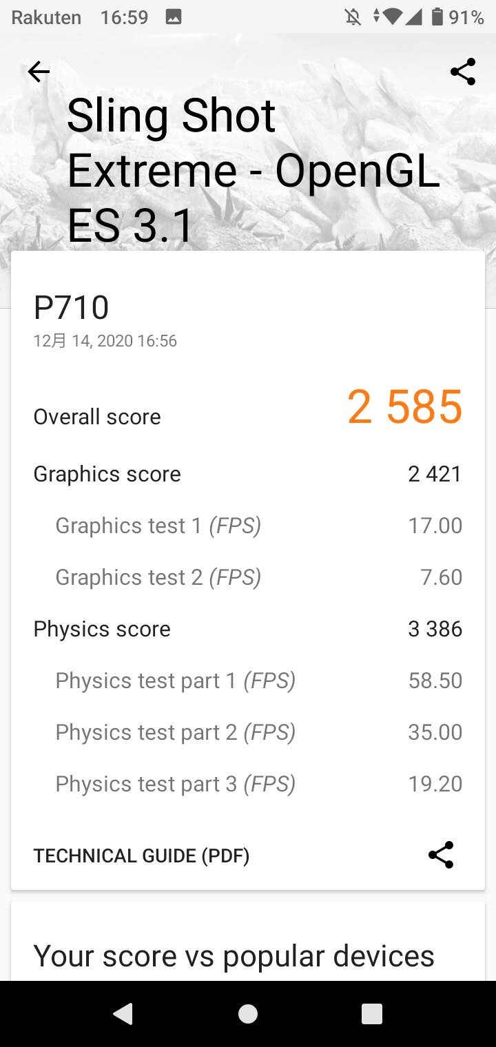 こちらはグラフィック性能を測る「3DMark」にてSling Shot Extremeの結果。OpenGL ES 3.1では2585、Vulkanでは2401となっています。動作は快適。カメラのシャッター音だけでなく、スクリーンショットの撮影音も消せないのは少し残念なところ