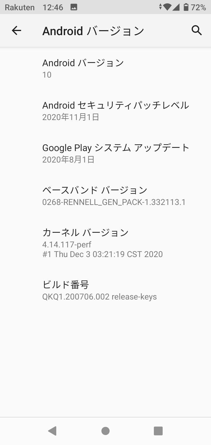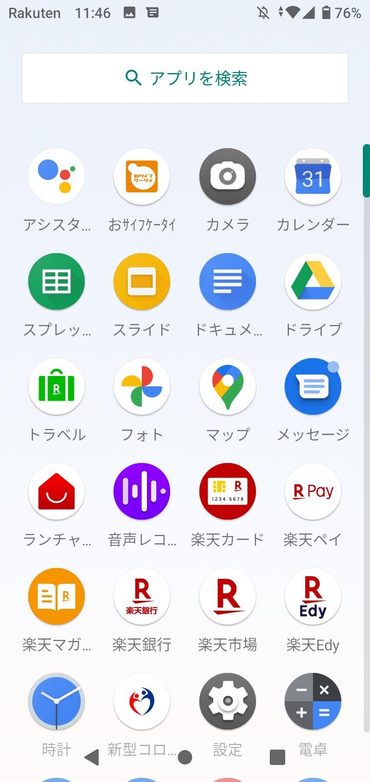 アプリ一覧。新型コロナウイルス 接触確認アプリ(通称:COCOA)がプリインストールされているのはなかなか良く、COCOAを含め、楽天系の楽天市場や楽天トラベル、楽天銀行、楽天カード、楽天ペイ、楽天Edy、楽天マガジン、Rakuten Music、Rakuten TVの各アプリはアンインストールが可能となっています