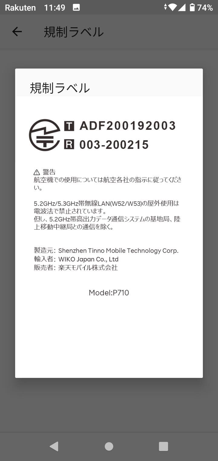 すでにソフトウェア更新が配信されており、最新バージョンにしたところ(画像=左)。OSはAndroid 10をプリインストール。モデル名は「P710」、いわゆる「技適」の番号は電波法に基づくRが「003-200215」、電気通信事業法に基づくTが「ADF200192003」