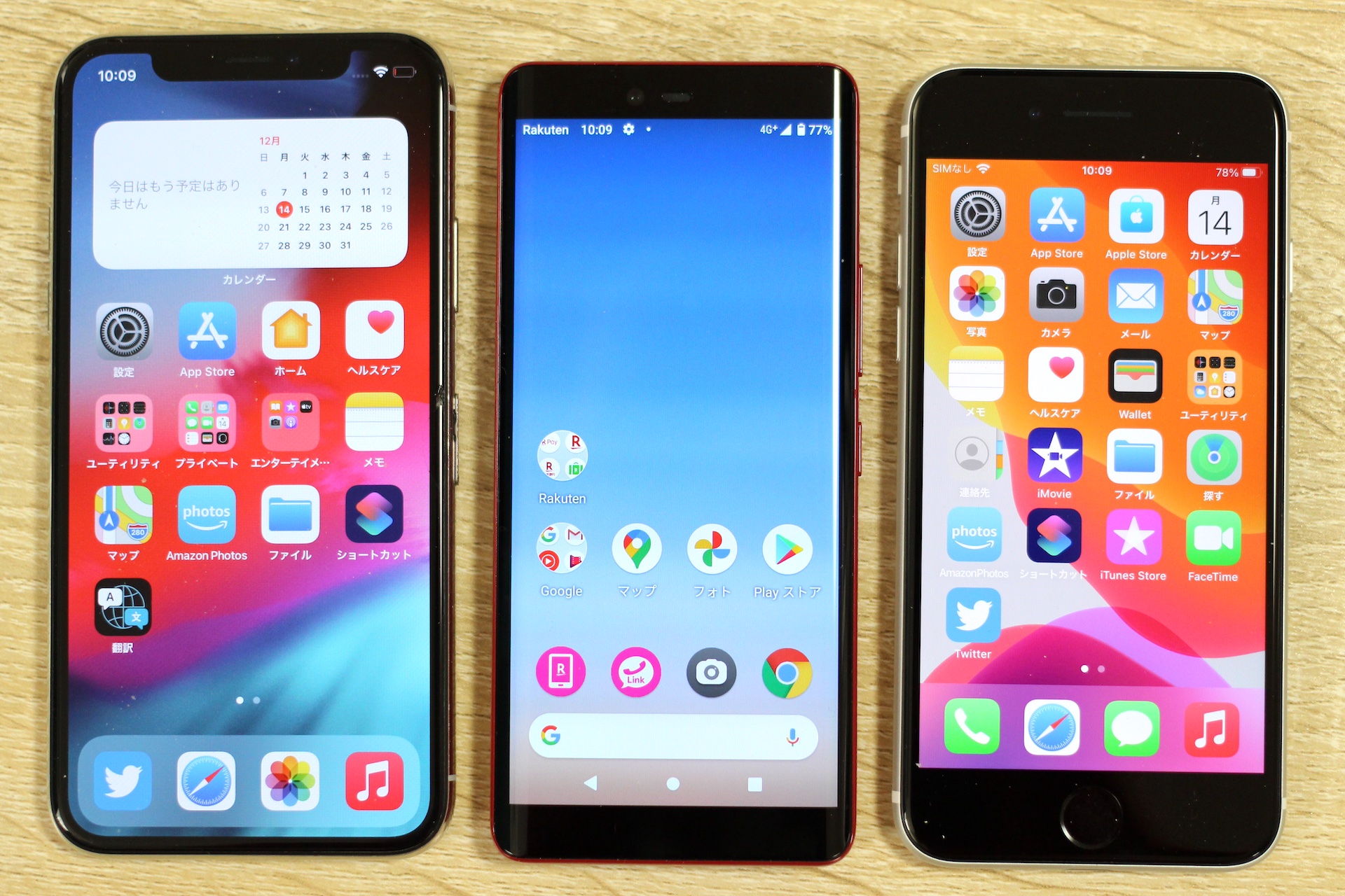 今度は右に5.8インチサイズのiPhone X(左)、左に4.7インチサイズのiPhone SE(第2世代)を並べてRakuten Hand(中央)と比べてみました。縦はiPhone SE(第2世代)にかなり近いように思います