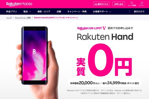 Rakuten Handは本体価格(金額はすべて税込)が20,000円ですが、これまでにも「Rakuten Hand 発売記念キャンペーン」などによって実質1,980円などで販売されてきました。今回、新たに「Rakuten Hand19,999ポイントプレゼントキャンペーン」を実施し、Rakuten UN-LIMIT Vをはじめて申し込む場合に5,000ポイントがプレゼントされる「【Rakuten UN-LIMIT Vお申し込み特典】だれでも5,000ポイントプレゼント」と合わせて第際24,999ポイント還元となり、実質0円以下となります。