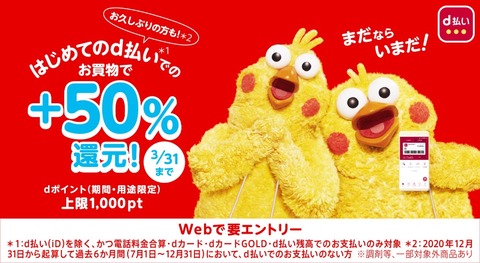| d払いにて初めて利用または過去6ヶ月間利用がない場合に50%ポイント還元! |
