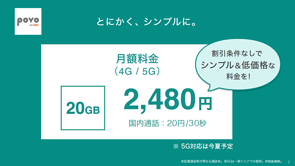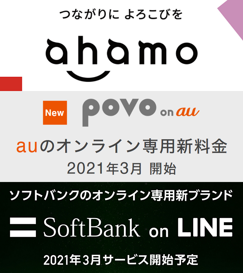 移動体通信事業者(MNO)のメインブランドとしてのデータ通信容量20GBの料金プランでは、2020年12月にNTTドコモの「ahamo」や、ソフトバンクの「SoftBank on LINE」が発表されていますが、今回のpovoはそれらの料金プランに対抗するものとして発表されました。