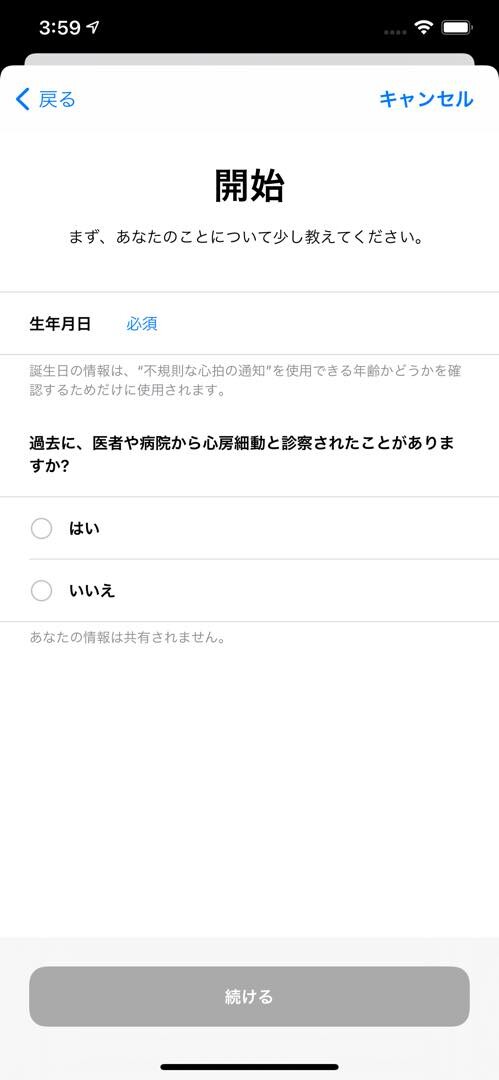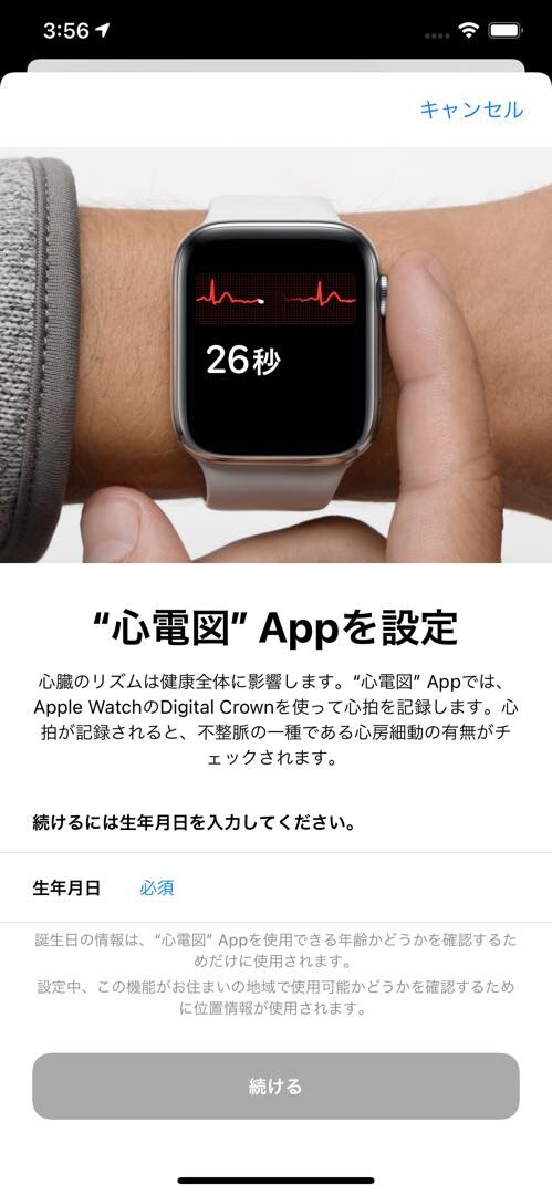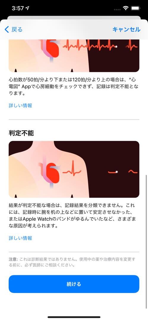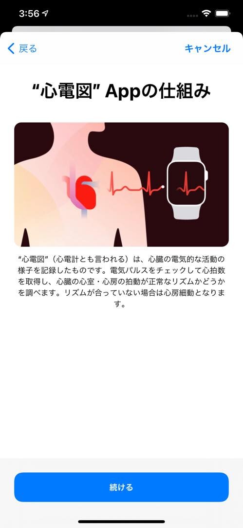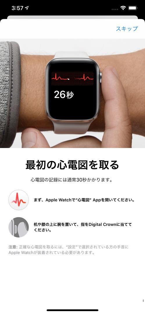 watchOS 7.3とiOS 14.4に更新し、Apple Watchで心電図アプリを起動すると、まずはiPhoneでヘルスケアアプリから設定を行うように案内されます
