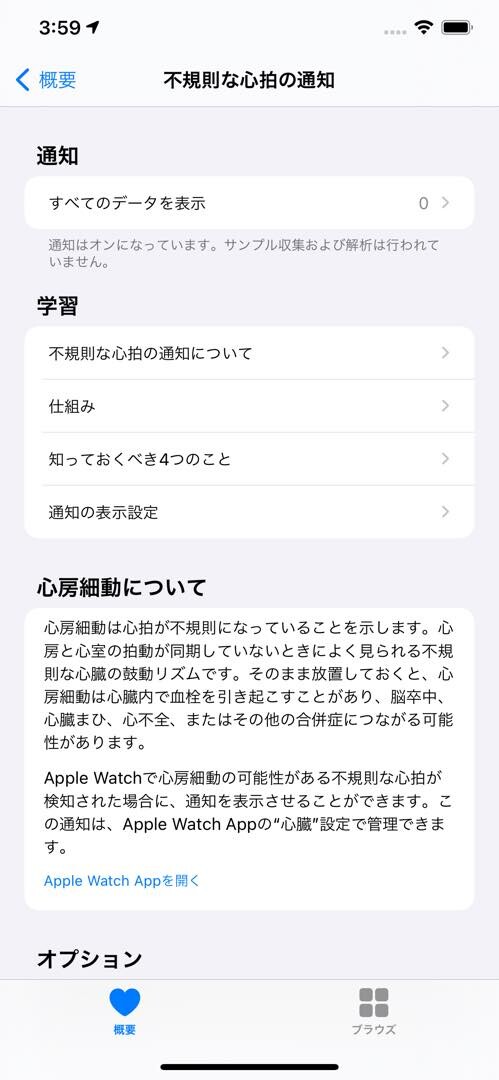 一方、不規則な心拍の通知機能は光学式心拍センサーを利用してバックグラウンドで心拍リズムを時折チェックし、心房細動(AFib)の兆候がある不規則な心拍リズムを特定した場合に通知をします。具体的には最低65分以上の時間をかけて5回の心拍リズムのチェックを行い、不規則な心拍リズムが検出されると通知されるとのこと。