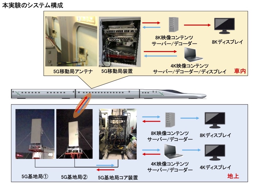 実験では沿線の2か所に5Gの新技術であるSA方式の実験用5G基地局(以下、地上基地局)を設置し、時速360kmで走行するALFA-Xに向けてあらかじめ制作した超高精細8K映像コンテンツを高周波数帯である4.85GHz(100MHz幅)の5Gで送信し、ALFA-X車内に設置した実験用5G移動端末(以下、移動端末)を介してシャープ製32V型8Kモニター(試作機)に配信しました。