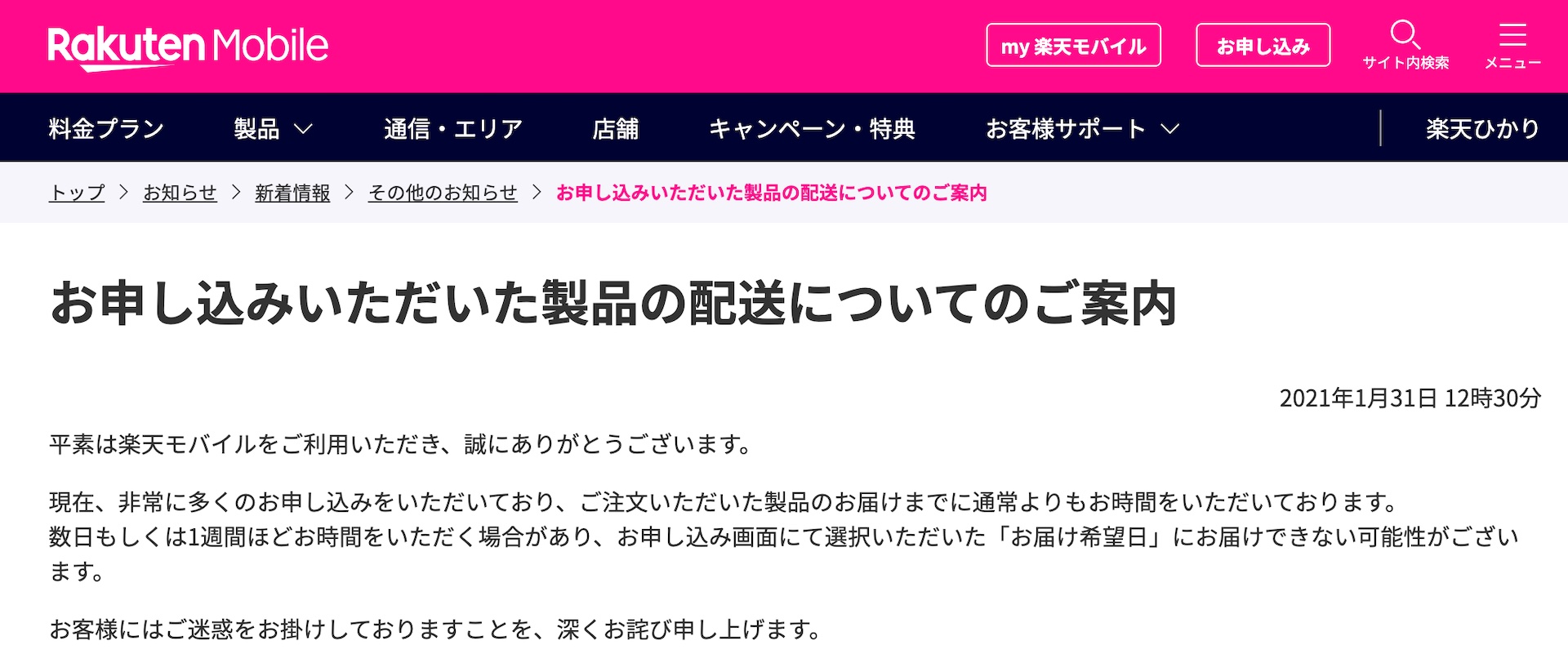 実際に1月31日にはアクセス集中のため、楽天モバイルの公式Webサイトおよびmy 楽天モバイルアプリ、楽天モバイルショップ(店舗)で一部の申し込みが完了しにくい状況が発生しており、非常に多くの申し込みがあるため、申込が完了した場合でも注文した製品の発送まで通常よりも時間がかかり、数日もしくは1週間ほどの時間がかかる場合があるとしています。そのため、申込画面にて選択した「お届け希望日」に届かない可能性もあるとのこと。