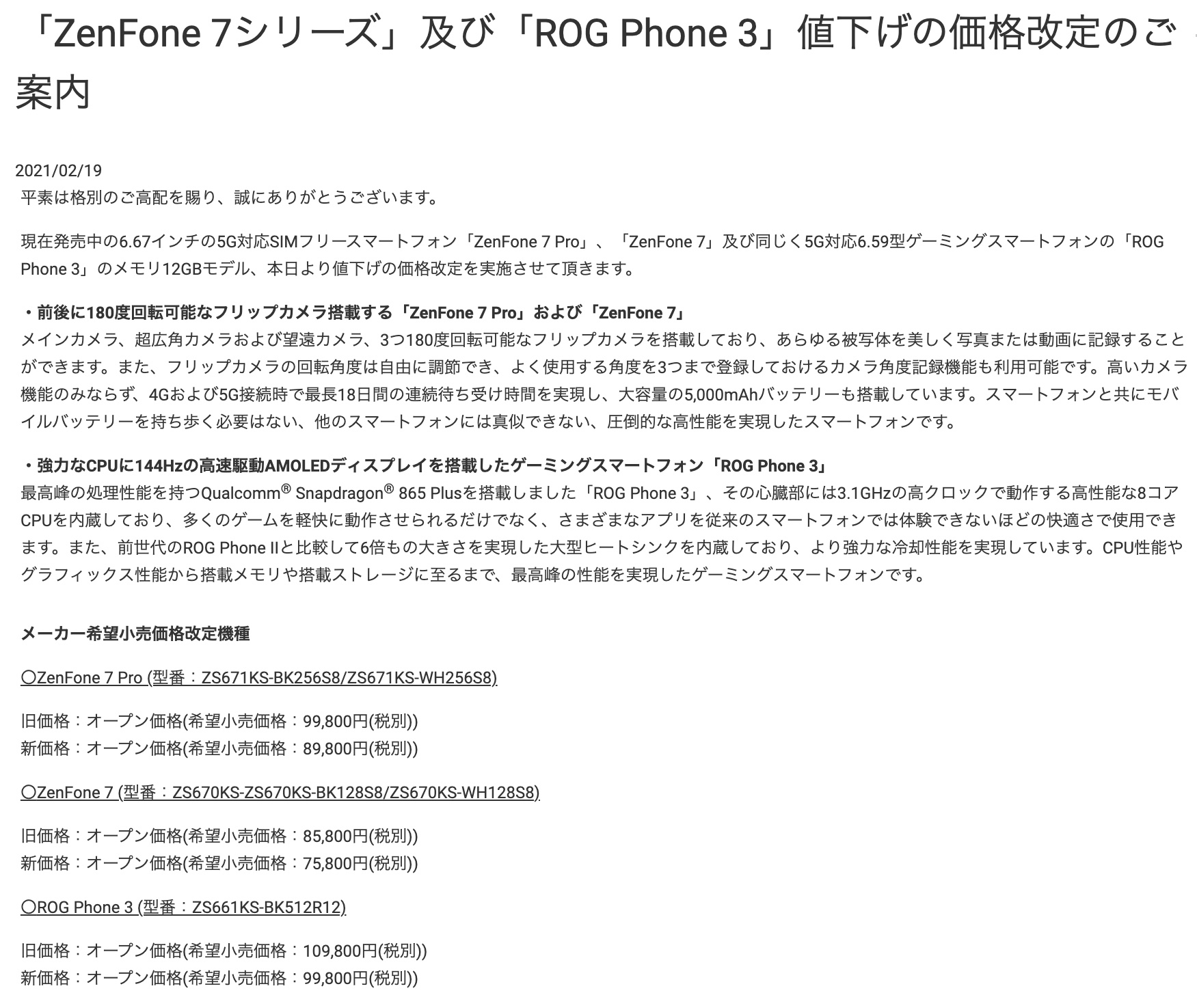 ・「ZenFone 7シリーズ」及び「ROG Phone 3」値下げの価格改定のご案内