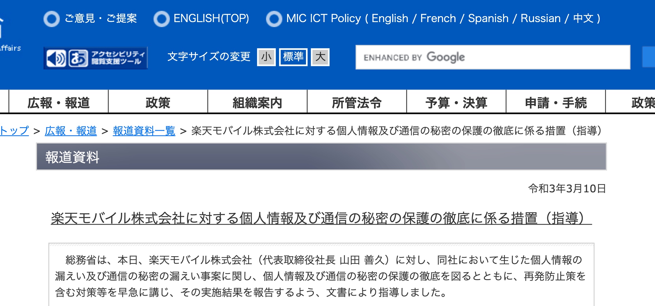 ・総務省|報道資料|楽天モバイル株式会社に対する個人情報及び通信の秘密の保護の徹底に係る措置(指導)