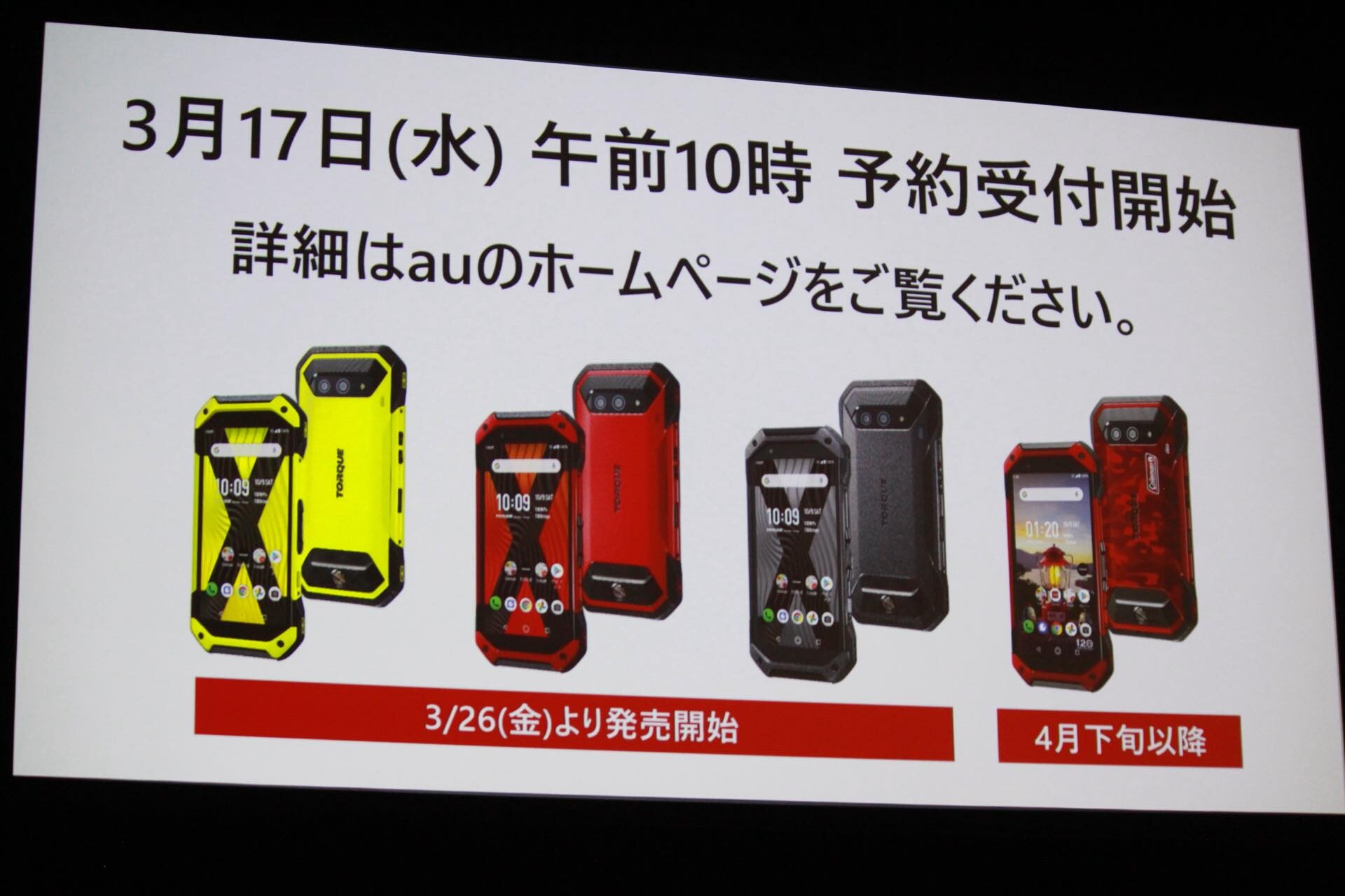 発売に先立って2021年3月17日(水)10時に予約開始され、TORQUE 5Gの発売日は2021年3月26日(金)となっており、販路はauショップや量販店などのau取扱店および公式Webストア「