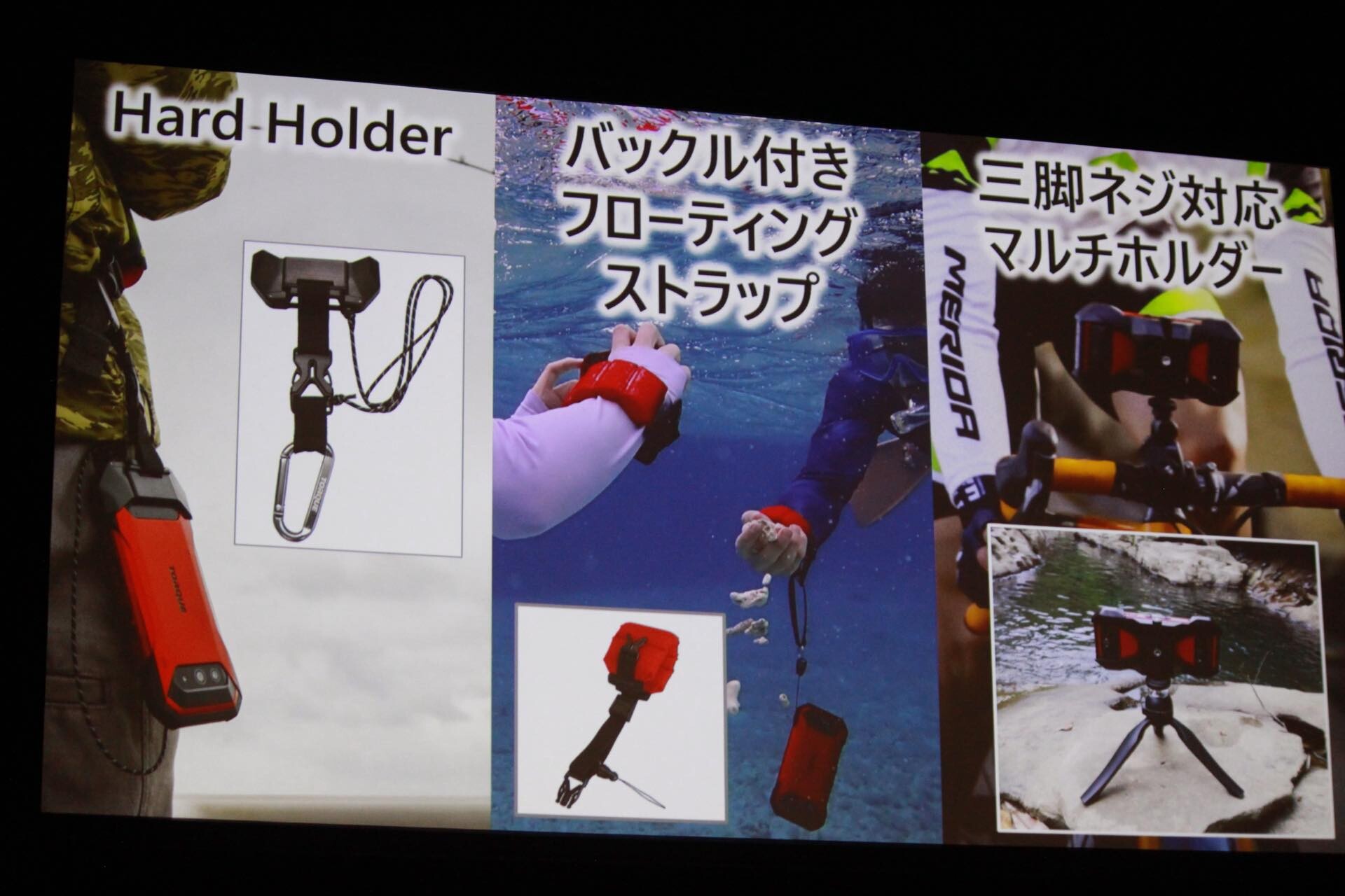 中でも耐衝撃は2mの高さからサンドペーパーを敷いた鉄板に落とした試験をクリアして落下でさらに壊れにくくなり、泡ハンドソープで洗ったり、アルコール除菌シートで拭いてもOKとなっています。もちろん水深2mの海水にも耐える耐海水や43℃以下のお湯で洗い流して使える耐温水シャワーも引き続いて対応しており、海やお風呂などでも心配なく使えます。さらにアウトドアで使うための周辺機器もカメラネジに対応した市販の撮影スティックや三脚や自転車用のマウントに取り付け可能な専用マルチホルダーが用意されます。