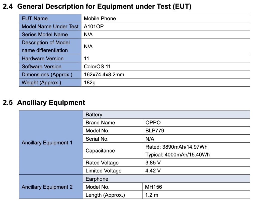 また電池パックが4000mAh(15.40Wh)の「BLP779」となっており、BLP779を搭載する製品としてはグローバル向けでは「OPPO A92s」や「OPPO A93」、「OPPO F17 Pro」、「OPPO Reno4 Lite」、「OPPO Reno4 F」が存在するものの、各機種ともにサイズや質量が異なっています。