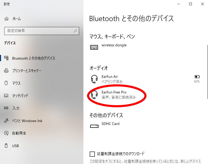 もちろんBluetoothに対応したパソコンにも接続できる。Windowsパソコンでは「Bluetoothとその他のデバイス」→「Bluetooth またはその他のデバイスを追加する」→「Bluetooth マウス、キーボード、ペン、オーディオ、またはその他の種類の Bluetooth デバイス」を選択し「EarFun Free Pro」が表示されたらクリックし、次の画面で「接続」をクリック、正常に接続できれば「完了」をクリックすればペアリングが完了する。