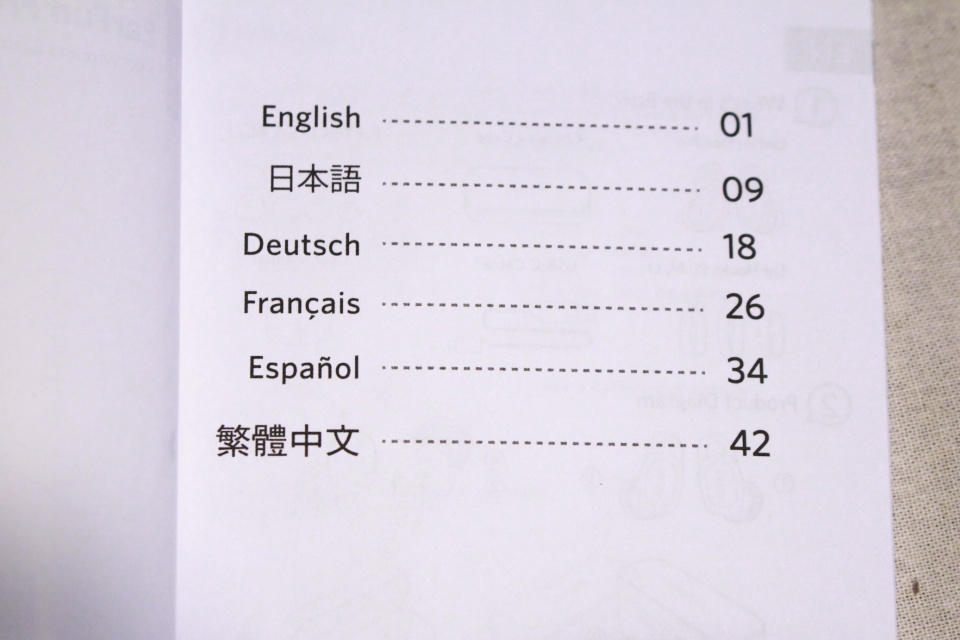 が同梱する。取扱説明書は全50ページの冊子で、English(英語)、日本語、Deutsch(ドイツ語)、Francais(フランス語)、Español(スペイン語)、繁體中文(中国語)の6カ国語で記載されている。