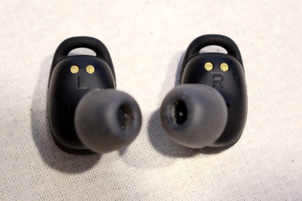 イヤホン本体は、丸みを帯びたスクエアな形状でとても小さい。内側には大きめにLR表記があり基本的には見やすいが、黒の本体に型押し表記のため暗い場所では見えにくい。