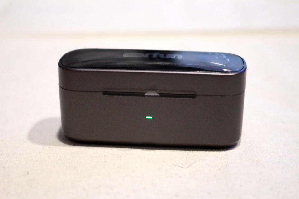 充電ケース正面のランプは蓋を閉じた際に点灯してバッテリー残量を知らせてくれる。30%以上は緑が点灯、30%未満はオレンジが点灯、10%未満は赤が点灯、5%未満は赤が点滅する。