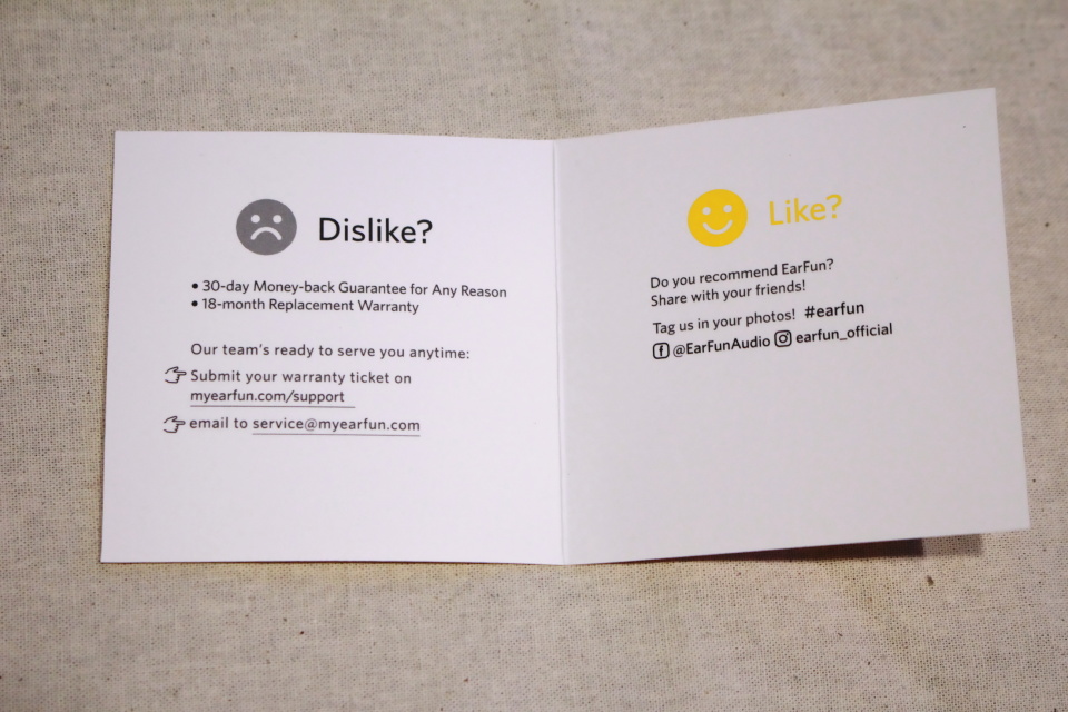 「EarFun Air Pro」(型番:TW302)や「EarFun Air」(型番:TW200)ではバラバラの状態で個装箱内に収められていたイヤーピースやUSBケーブルがEarFun Free Proでは専用のプラスチック板に綺麗にセットされた状態で収納されている。これならイヤーピースやイヤーフックも取り出しやすい。