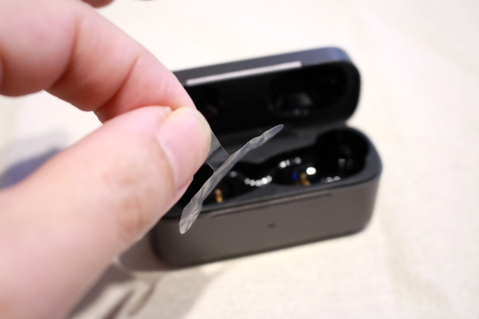 最初からイヤホン本体が充電ケースに収納されているため、充電端子部分に絶縁用のフィルムが貼ってある。まずはこのフィルムをはがし、再びイヤホン本体を充電ケース挿入して蓋を閉める。再度、充電ケースの蓋を開けるとイヤホンの左右ともに青色に点滅してペアリングモードになるので、スマホのBluetooth設定でペア設定をする。
