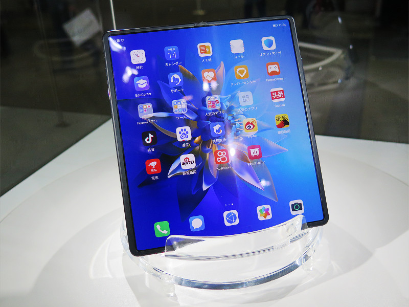 端末展示コーナーのその一角には日本未発売のフォルダブルスマートフォン「HUAWEI Mate X2」が展示されていました。