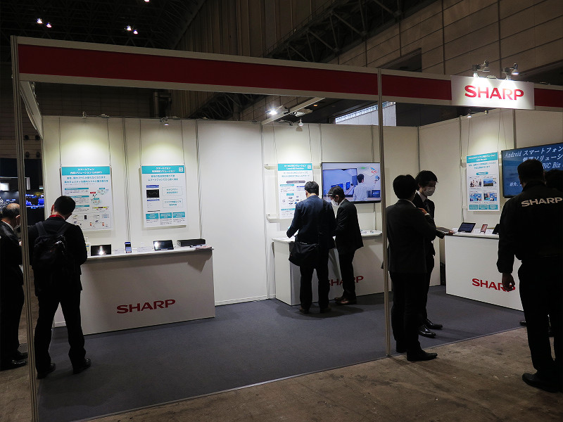 シャープのブースでは構内の内線通話にsXGPでスマホを利用するためのシステムの解説のパネル展示などを行っていました。